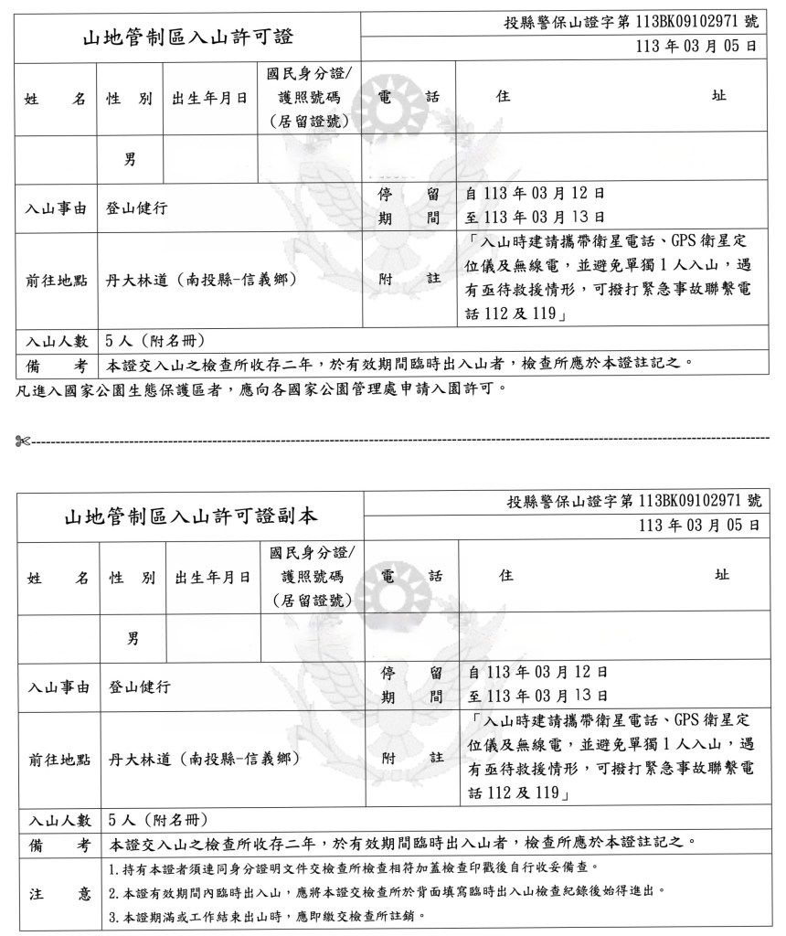 要進入丹大林道、六順山、七彩湖,必須要在5日前向「內政部警政署入山案件申請系統」申請入山證,如果已經是在5日之內,則可到地利當地的「南投縣政府警察局信義分局青雲派出所」去進行申請。本次的範本如下: