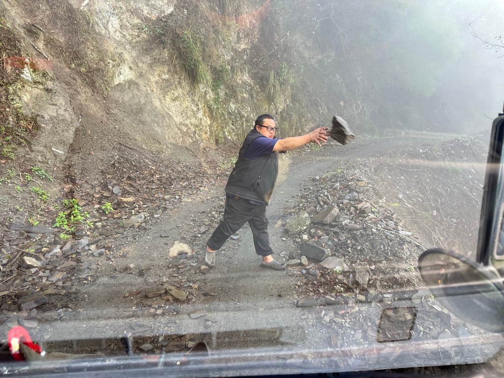 上圖:由於之前連日下雨,林道上出現有落石,我們的接駁大哥大腦正下車在清理落石。