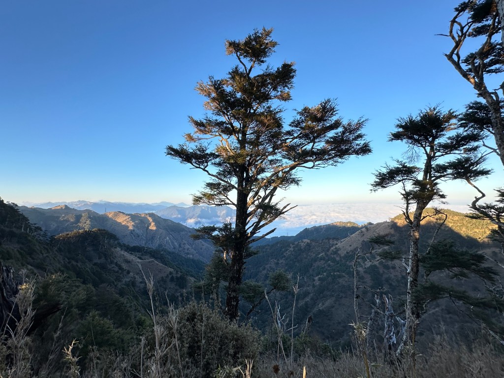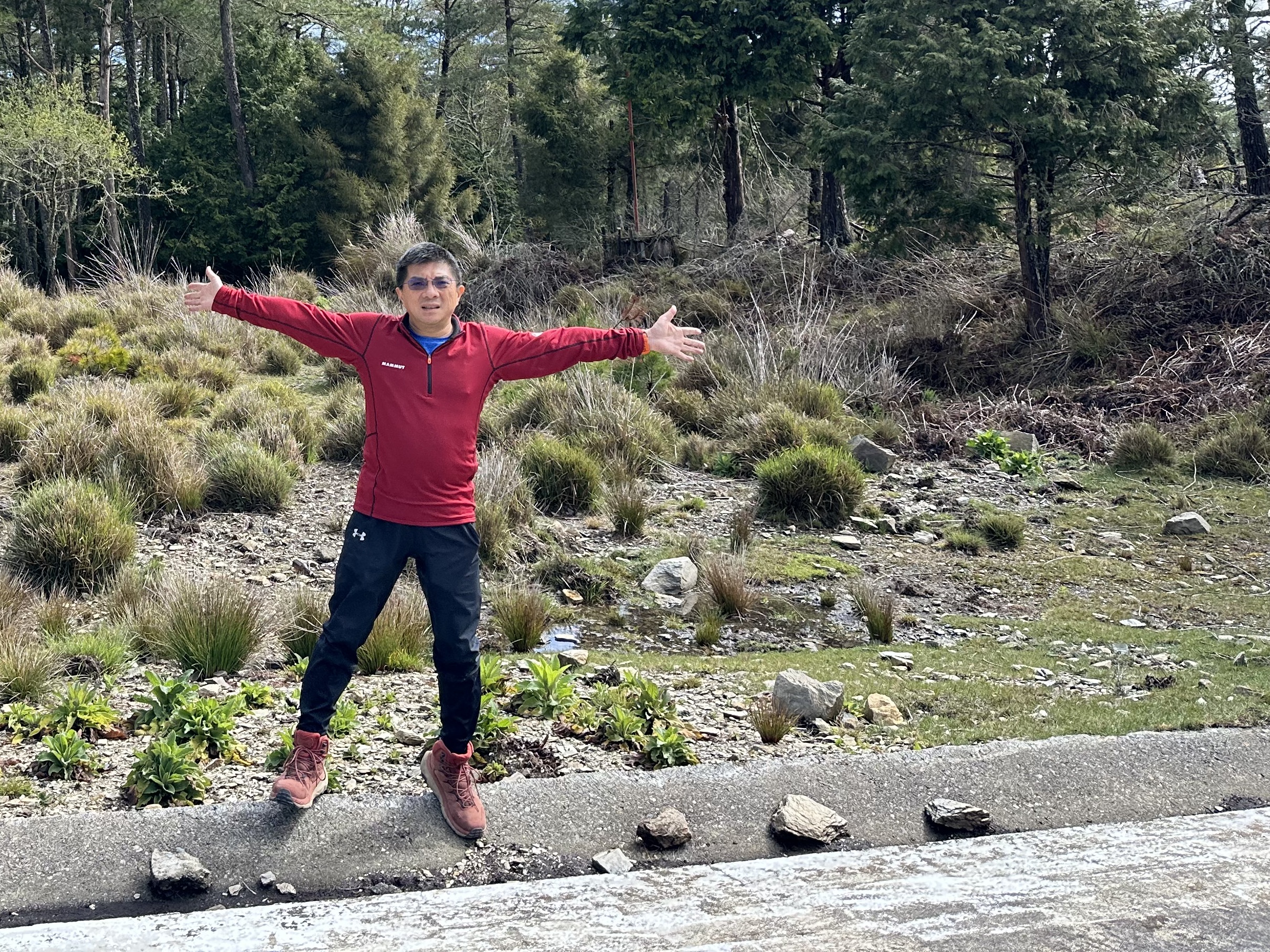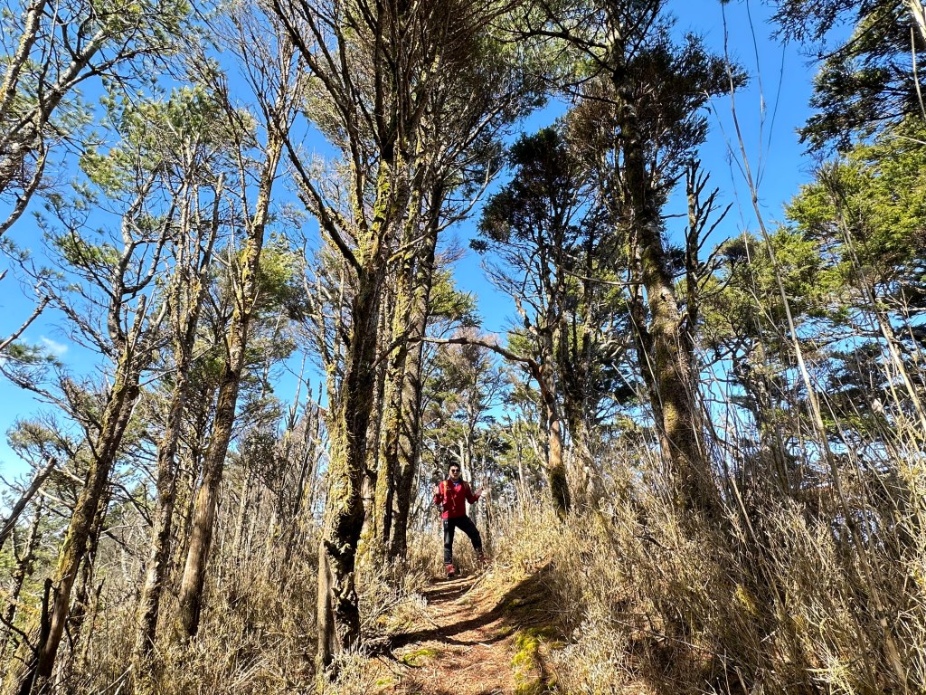 但從23.5K的六分所之後,一直到36.5K的孫海招待所及海天寺,這一段就會進入杉木林的林相,一路美美而過。接著,過了孫海招待所及海天寺後,遇到一岔路,往右走開始支線的里程,由此支0K一直到七彩湖營地的支18.75K止,海拔也由H2400m逐漸陡上到H2950m,此時杉木林亦開始退出並逐漸轉而都是低矮的波波草及箭竹林。
