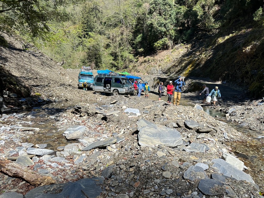朋友們若要一訪六順山及七彩湖,皆要利用這一區每年一月到三月的枯水期。本文記錄的六順七彩之旅,是由西線的丹大林道進入,清晨即驅車到台16線11.8K終點的孫海橋頭,此處的最終處有一個林務局的貨櫃屋,我們將車停在貨櫃屋前方台16線的路邊。接著,就要涉過濁水溪與丹大溪匯流的寬大河床。