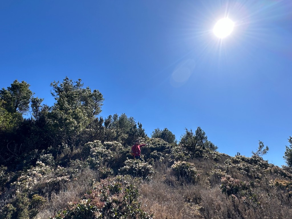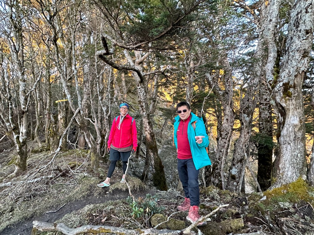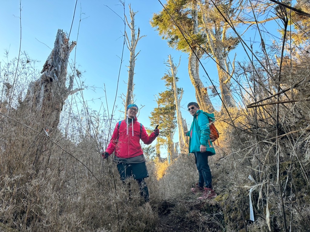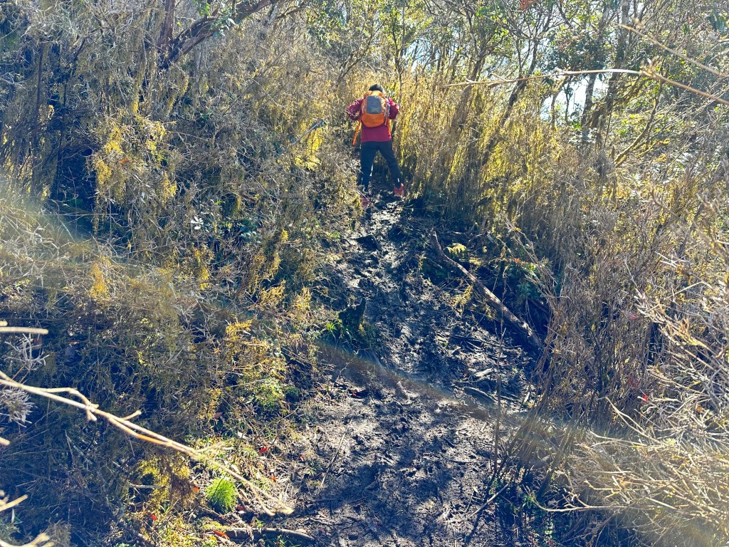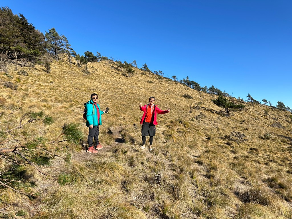 進入六順山步道後,前1K的路徑上都是很刺的馬醉木,雖然路徑清楚但偶爾刺手,1K到3.4K就一路陡上陡下,其中2.6K到3.4K這一段陡上陡下的起伏落差不小,過了3.4K後進入草原區,平緩一段最後200m直接陡上即可登頂六順山。登頂前遇到正要返回的美惠及以德夫妻倆。