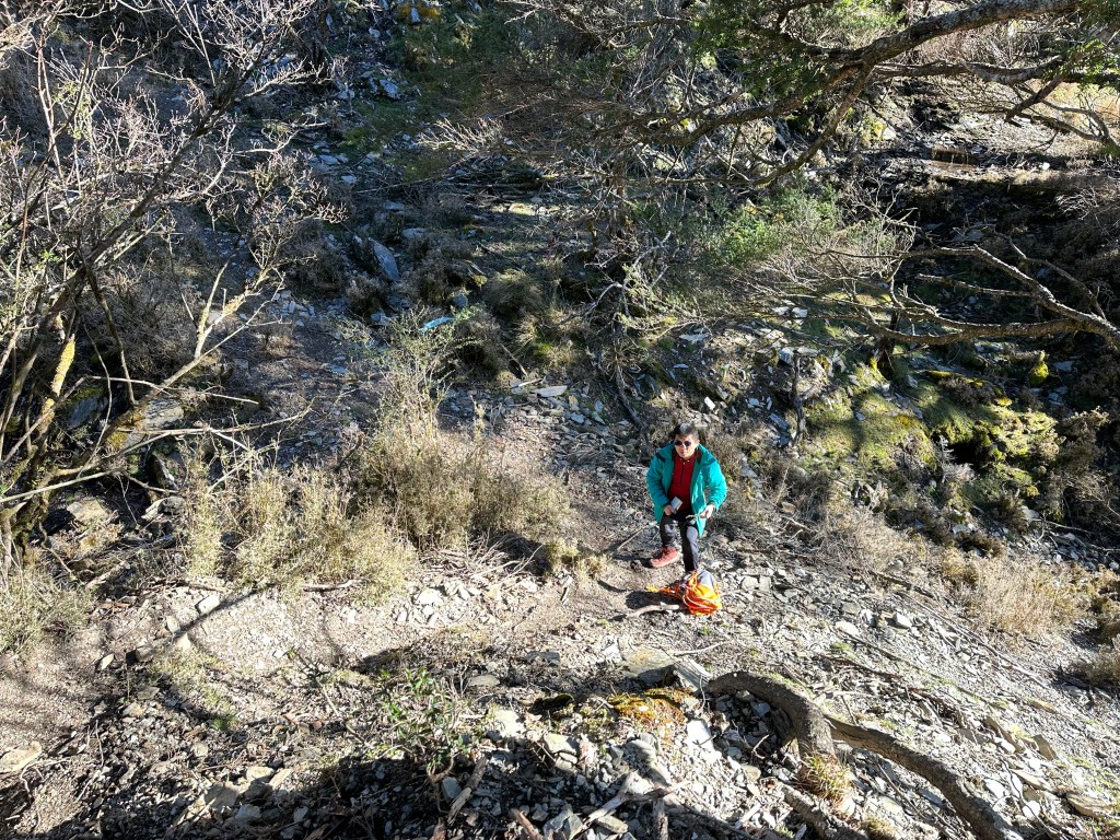 從七彩湖營地出發,跨過林道後路徑直接轉為陡下,要走250m的距離,由營地的H2950m陡下到七彩湖的H2890m,需陡下高度有60m。