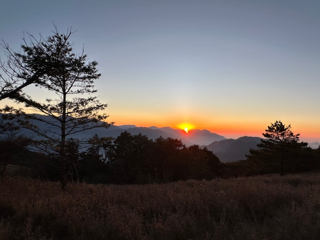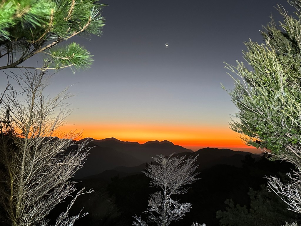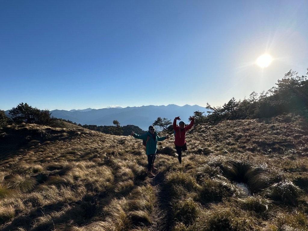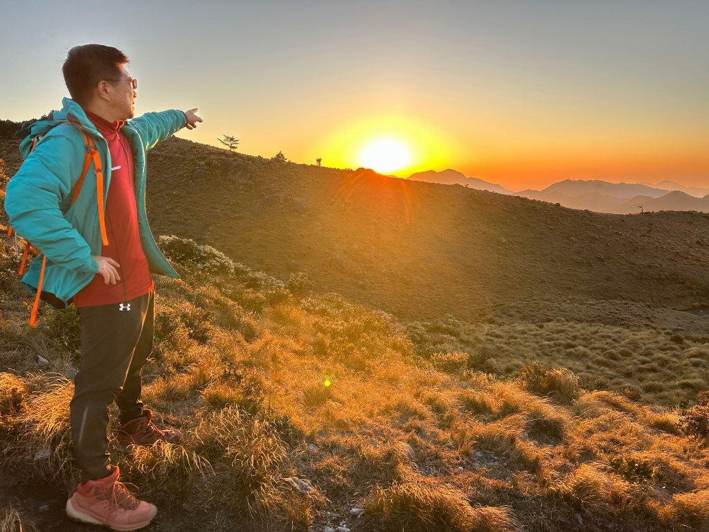 回程時,在3.2K處遠眺接下來回程的稜線,Smile說接下來的稜線像是烏龜的背還有頭,是有點像啦!當走到2.3K時看著夕陽西下,Jun、Smile與我(Gosen)忍不住停住腳步,猛拍一陣並沉浸在美麗的夜幕景色中。