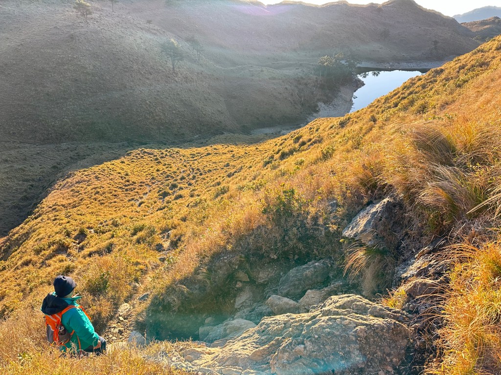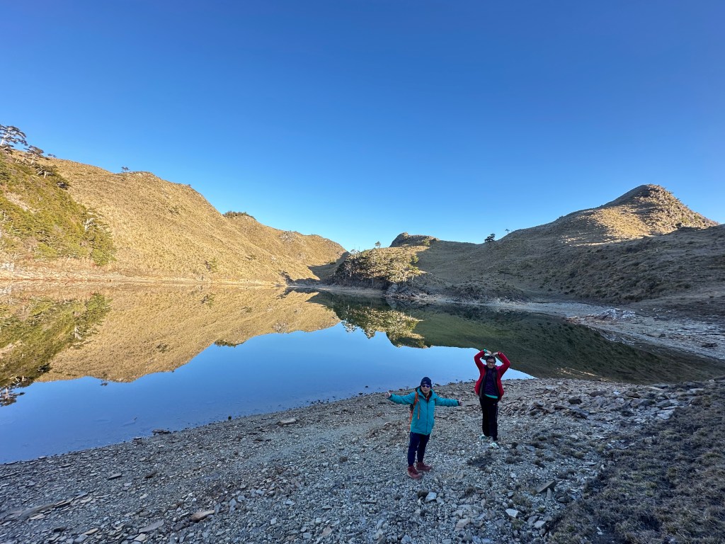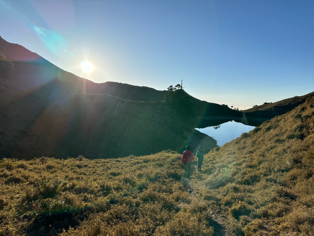 第二天清晨,當太陽逐漸升起時,大伙也早就由H1950m的七彩湖營地陡下到H1890m的七彩湖,等著陽光灑落的日出。陡下到七彩湖的路徑並不算得上好走,七彩湖是台灣第二大的高山湖,但如果你繼續往前走300m來到七彩湖妹池,就會感受到陽光灑落的妹池顯然更美!