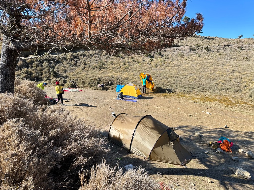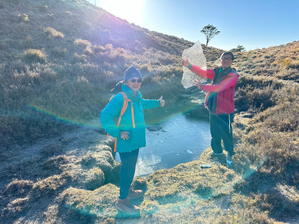 清晨起床時發現到帳棚上的露水都結成冰球了,這一夜還真是寒冷。
