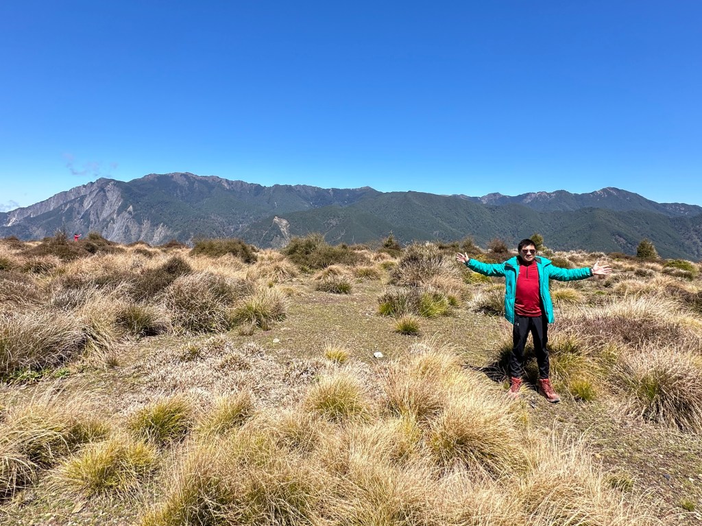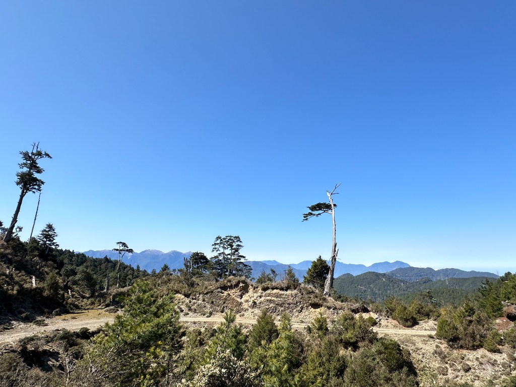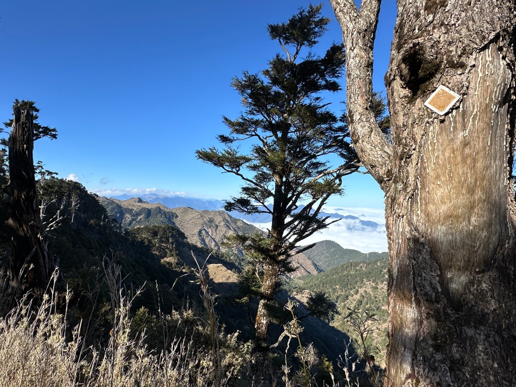 接著就往支19K的方向去光華復旦碑拍照,發現在光華復旦碑這裡,可以看到360度的百岳環景,包含干卓萬18連峰的稜線,比之支4.5K的展望點更加清楚。更可看到遠處的能高山及雪山等。另外,南三段的東郡丹大橫斷的各峰也看得清晰,真是大飽眼福!