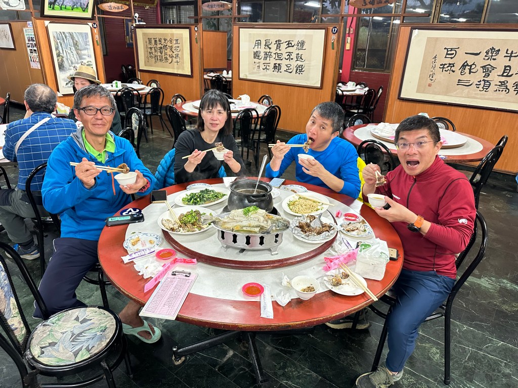 三人在晚間接近7點出六順山登山口,再步行在林道上走250m回到七彩湖營地,此時氣溫降得很快,一下就降到3度C左右,好在Jun對於烹煮非常熟捻,一下子就煮好一鍋羊肉爐+泡麵+火鍋料,一直吃到三、四碗後身體才開始覺得溫暖。一定是因為氣溫很低,五人都偶有發生抽筋現象。睡前,Jun、Smile、我(Gosen)直接拿出一瓶玫瑰紅三人共同分享!