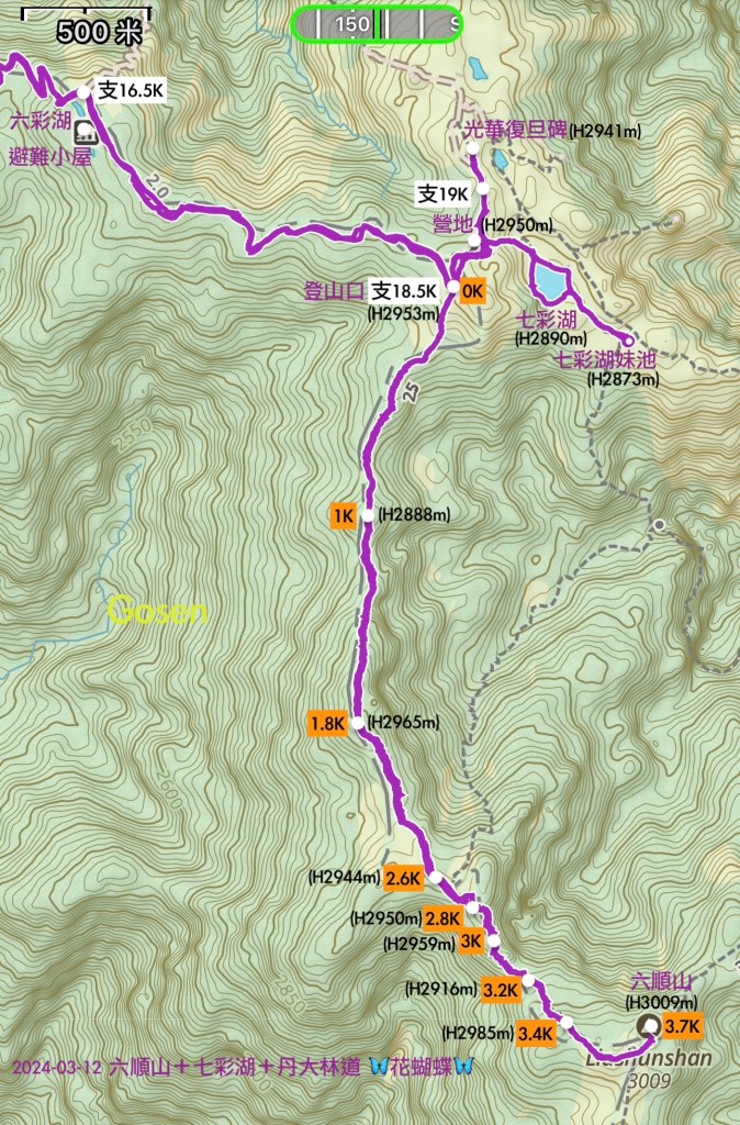 我自己的Garmin手錶顯示六順山的海拔為H3014m,離線地圖中的Gaia GPS顯示為H3012m,而山林日誌則顯示為H3009m。回程後,也詢問了一下樂活玩童的美惠,她也表示她的紀錄也是H3014m。所以,六順山真的沒有超過海拔3000公尺嗎?個人有些懷疑?