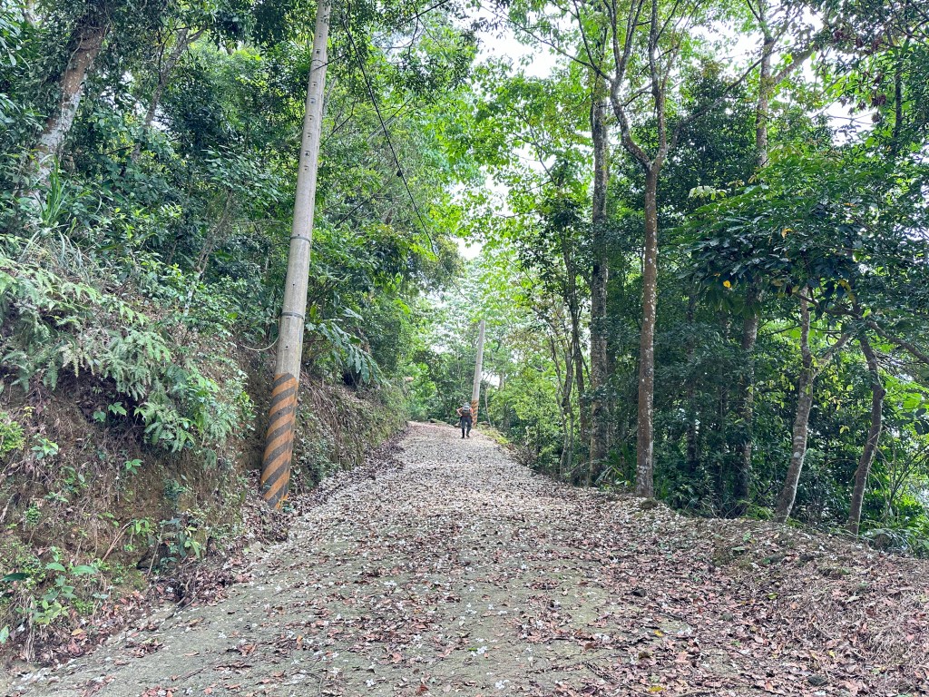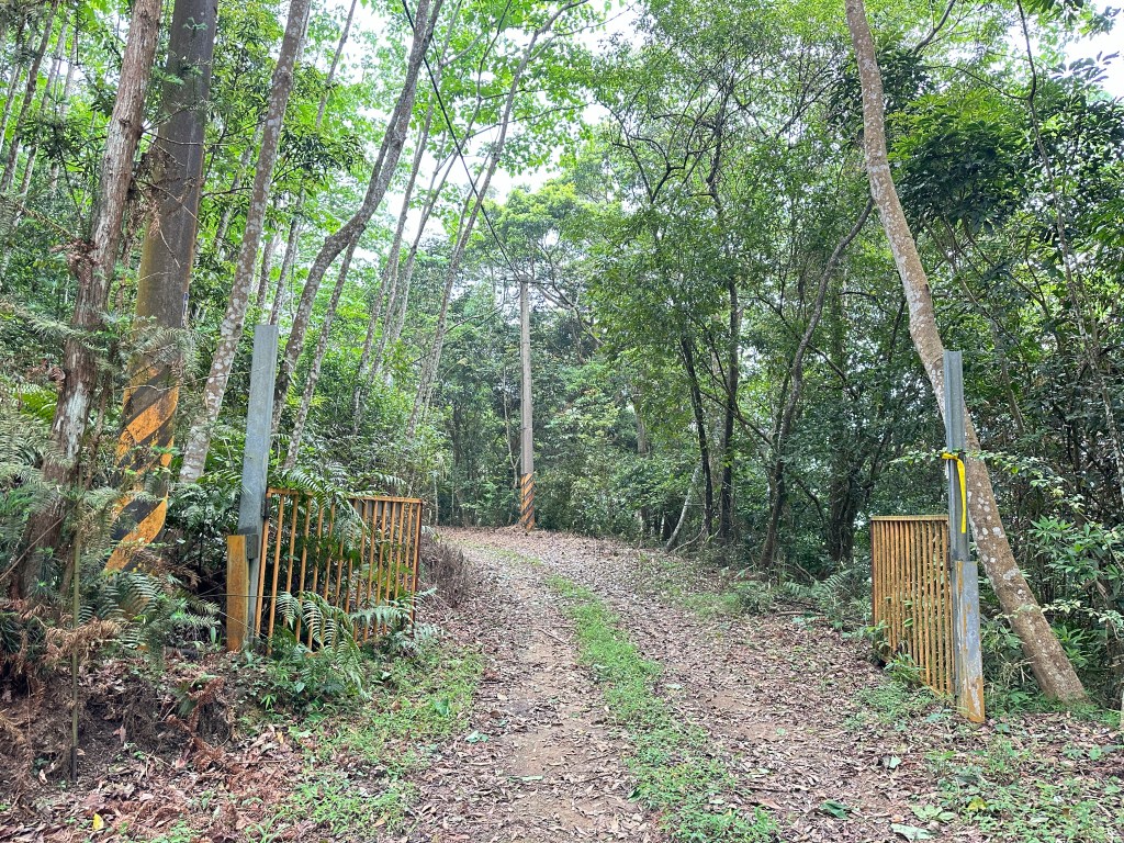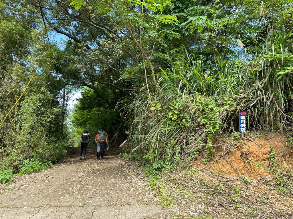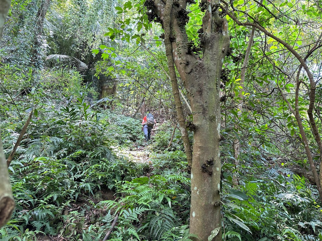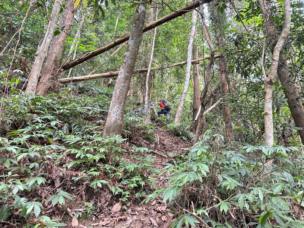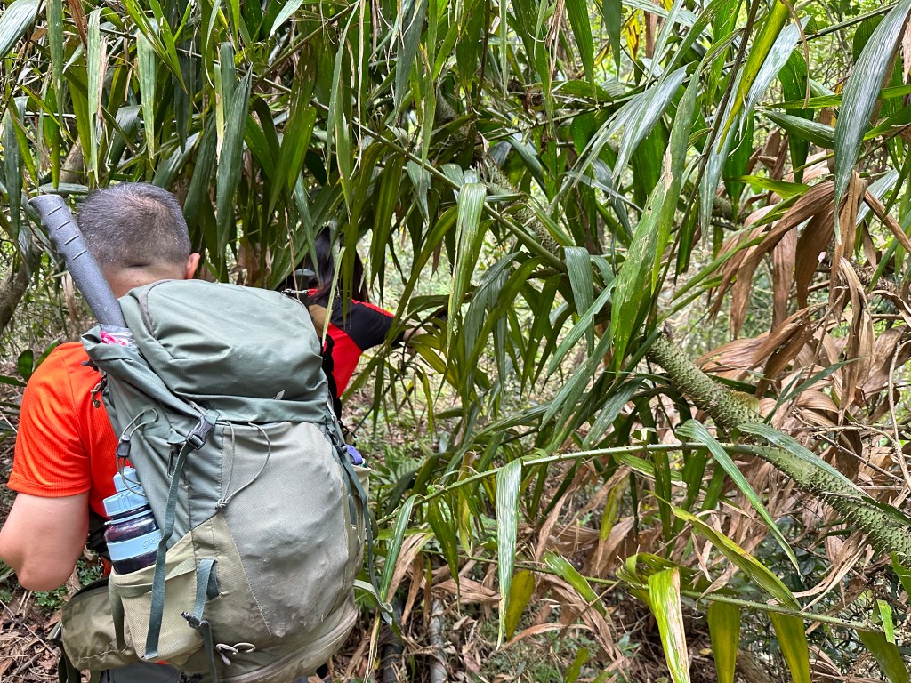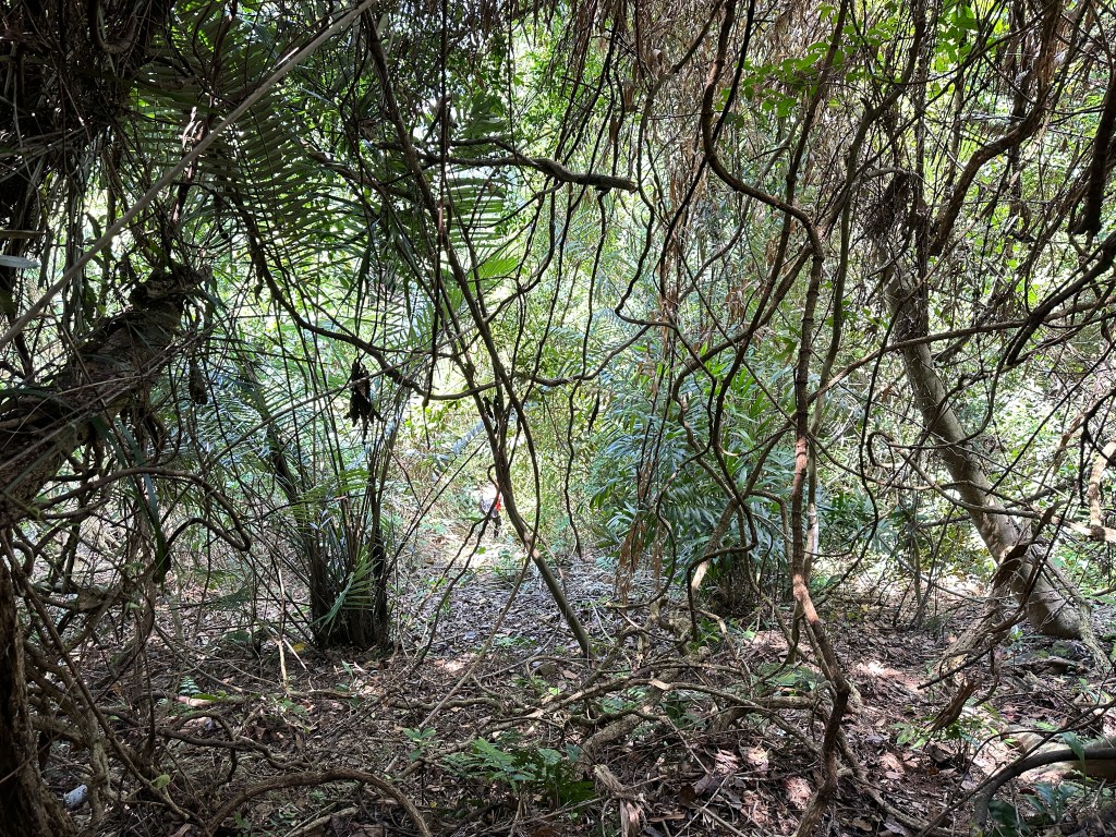 接著,沿著道路陡下一小段,在道路右側可通往山徑,這一段可能要請朋友們下載離線地圖軌跡來確定路線,由此,往四崙頂山走,是一條捷徑路!如果繼續沿著社區道路去繞,要多走近4K,而且還會再度遇另兩道封閉大門及走到私人土地上。但一進入捷徑路,看到的景象跟我們去年來過時一樣,仍然有超豐厚的刺人黃藤檔路?這一次,Smile不退縮了,要我們拿出鐮刀砍伐,稍微砍了一小段約50m後,突然展望大開!