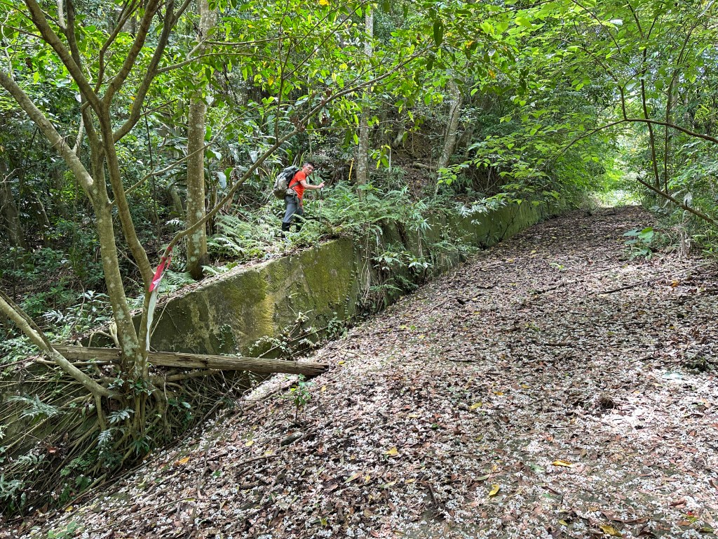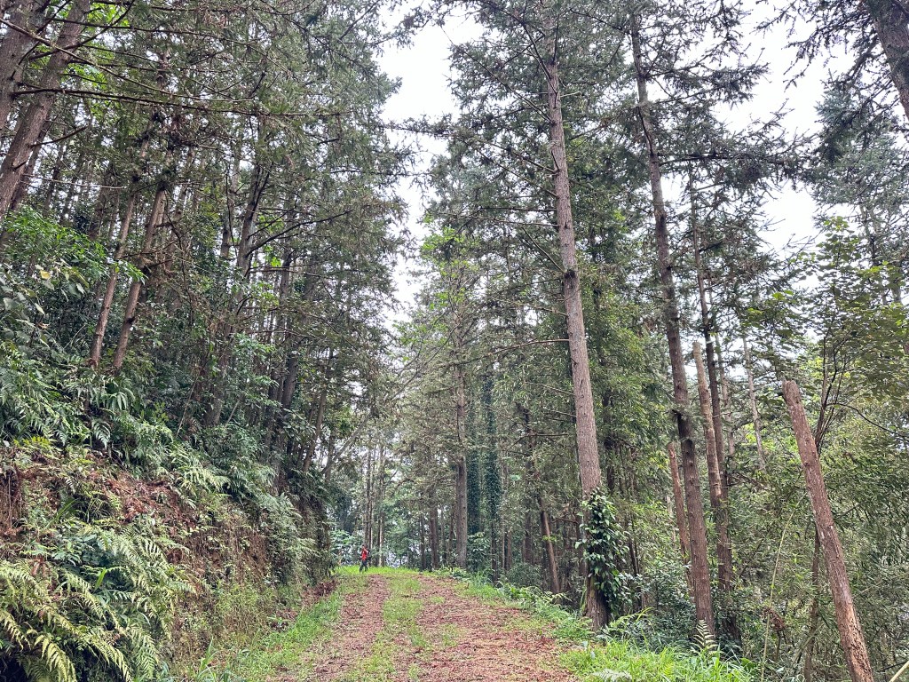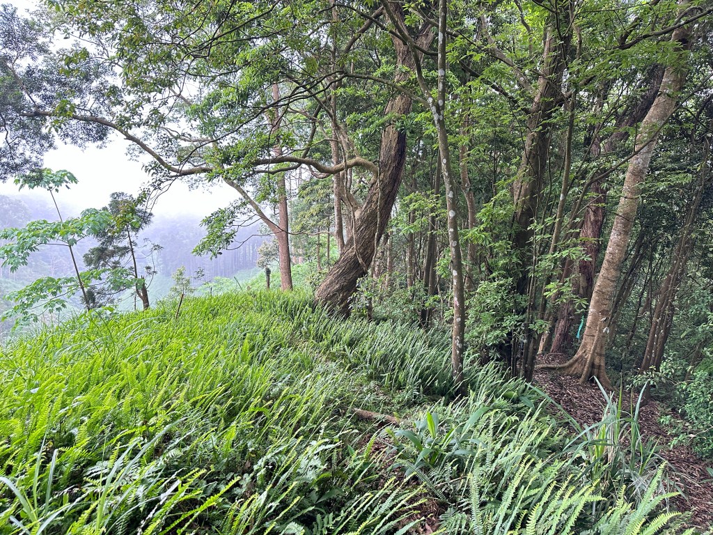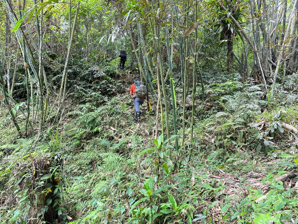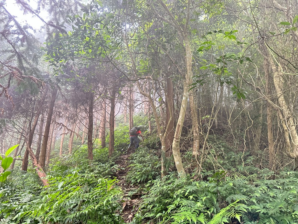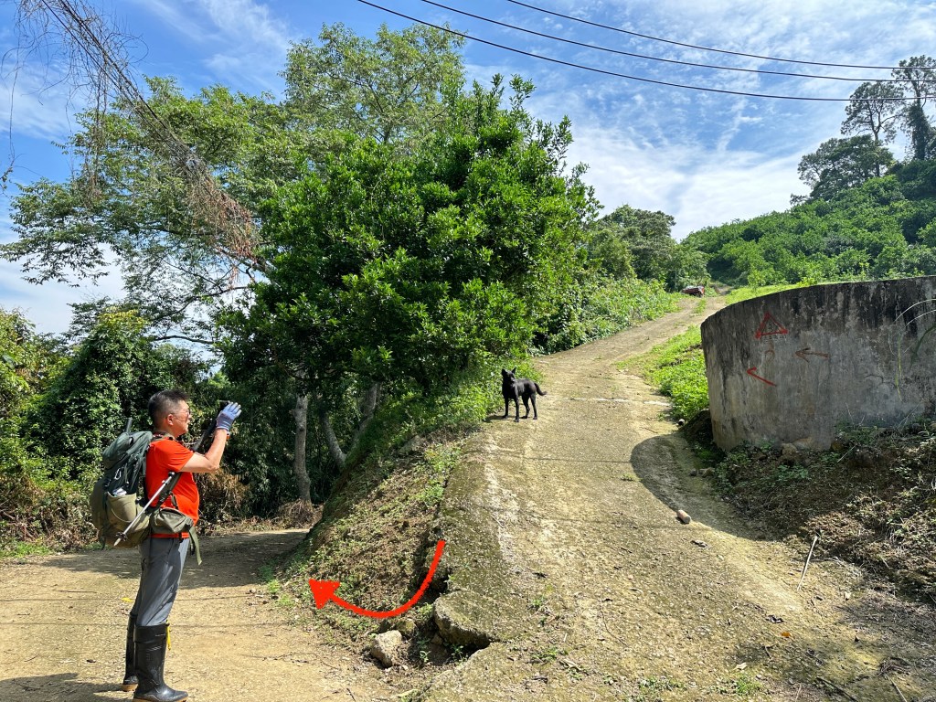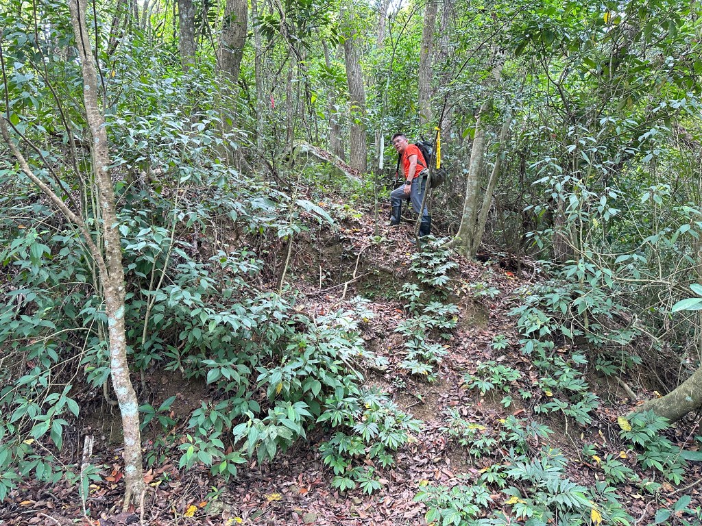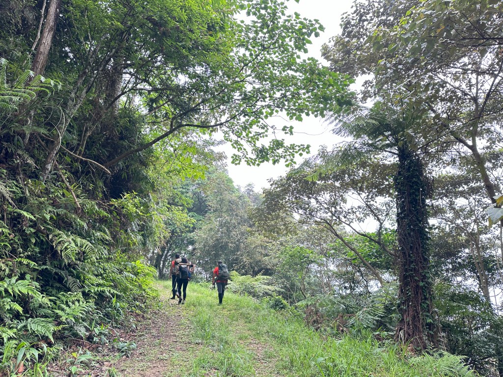 接著,沿著道路陡下一小段,在道路右側可通往山徑,這一段可能要請朋友們下載離線地圖軌跡來確定路線,由此,往四崙頂山走,是一條捷徑路!如果繼續沿著社區道路去繞,要多走近4K,而且還會再度遇另兩道封閉大門及走到私人土地上。但一進入捷徑路,看到的景象跟我們去年來過時一樣,仍然有超豐厚的刺人黃藤檔路?這一次,Smile不退縮了,要我們拿出鐮刀砍伐,稍微砍了一小段約50m後,突然展望大開!