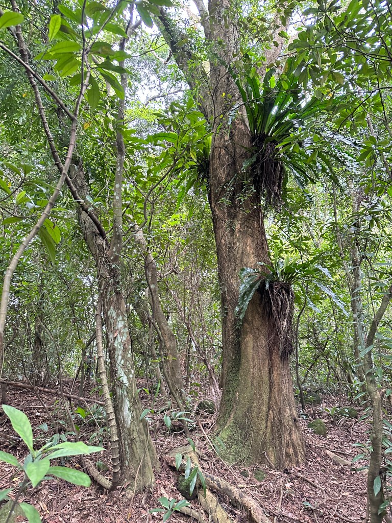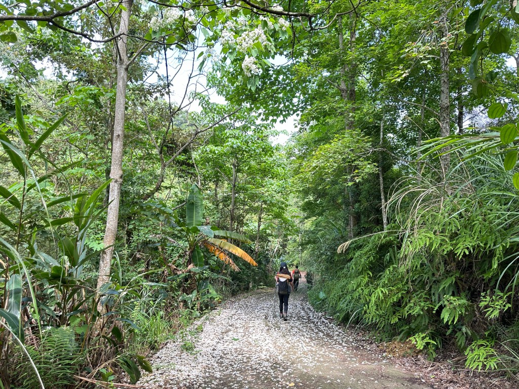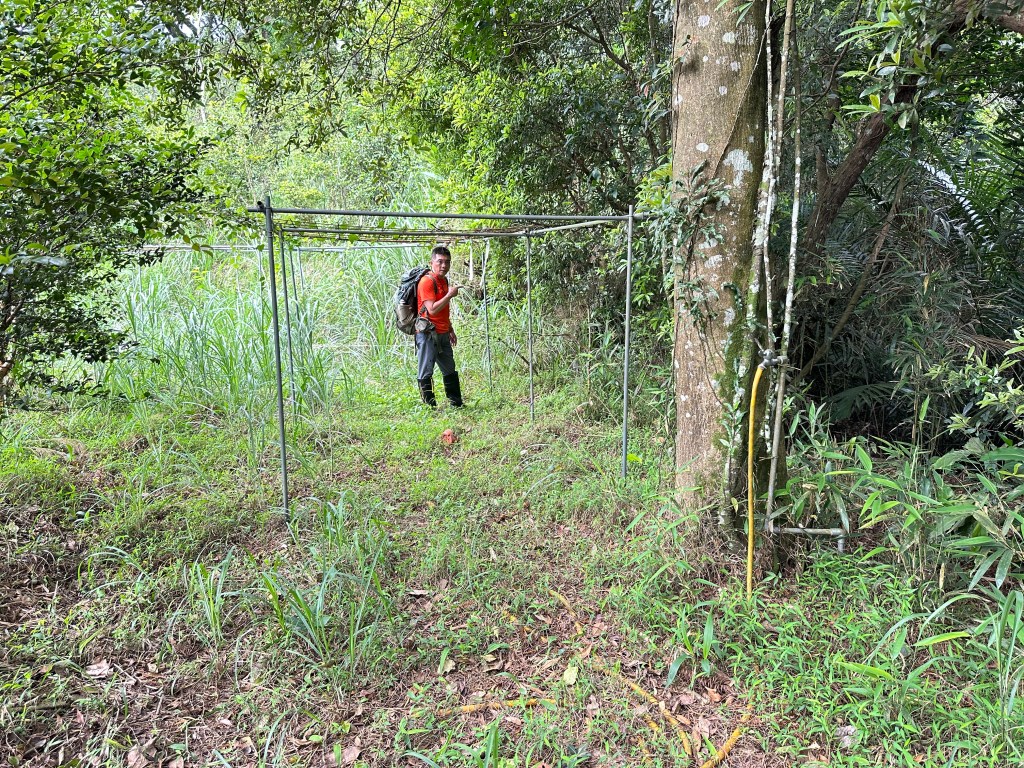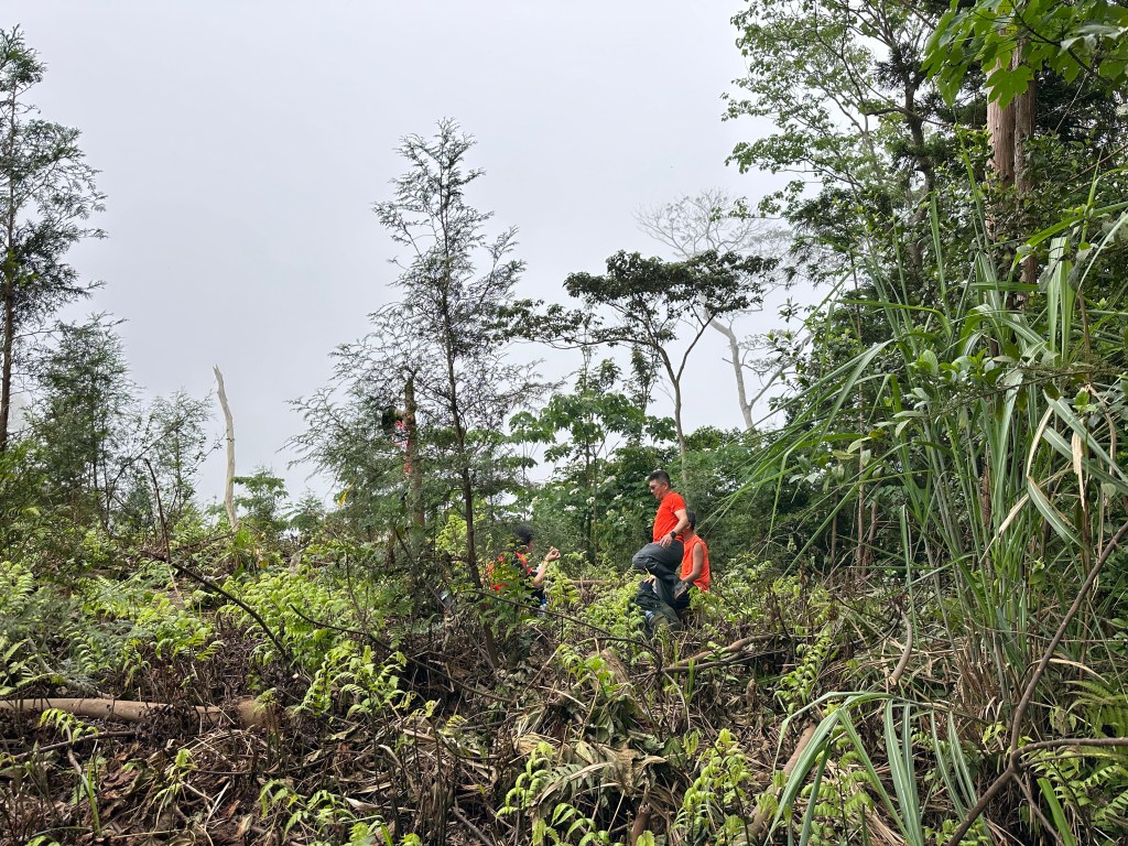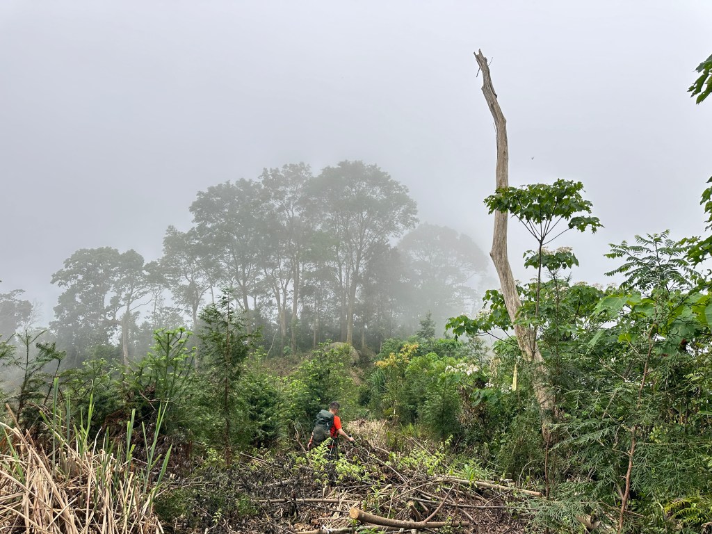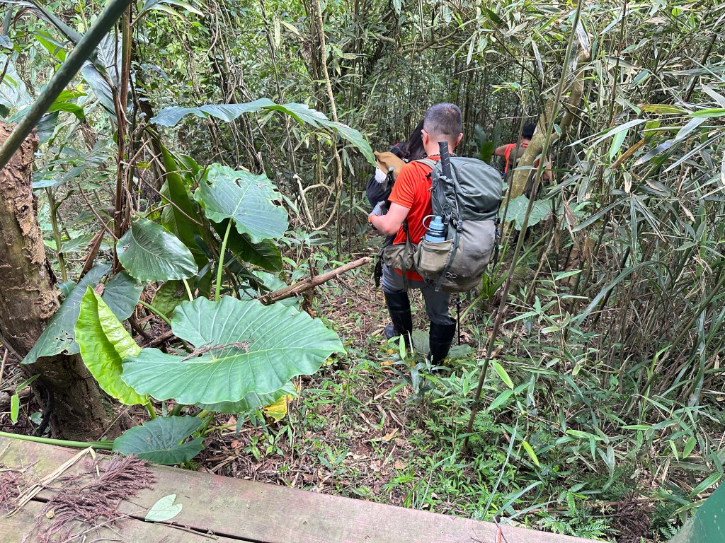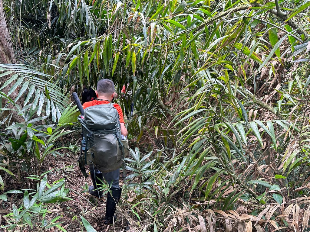 接著,沿著道路陡下一小段,在道路右側可通往山徑,這一段可能要請朋友們下載離線地圖軌跡來確定路線,由此,往四崙頂山走,是一條捷徑路!如果繼續沿著社區道路去繞,要多走近4K,而且還會再度遇另兩道封閉大門及走到私人土地上。但一進入捷徑路,看到的景象跟我們去年來過時一樣,仍然有超豐厚的刺人黃藤檔路?這一次,Smile不退縮了,要我們拿出鐮刀砍伐,稍微砍了一小段約50m後,突然展望大開!