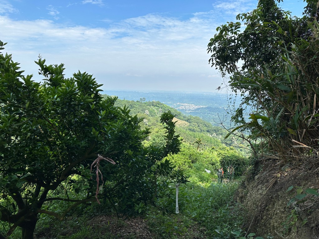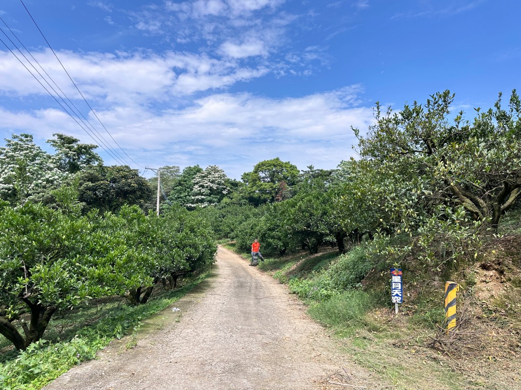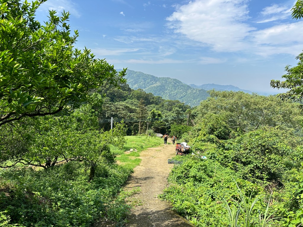 原來,接下來的路徑優美得很,隨著優美路徑的石梯陡上,到了一個工寮,接著,就由工寮右側的路徑直接由將近70度的陡坡一路陡下300m的距離,大約要陡下150m的高度(從H650m陡下到H510m)。陡下後,接上產業道路,轉進往星月天空露營場的方向,沿著產業道路陡上到最高處,會看到有一戶民宅,民宅前有一片橘子園,四崙頂山三角點就在橘子園的最右側高點處。