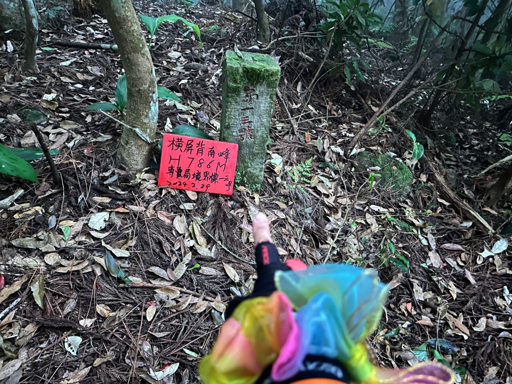 接著,就一路下山,走約100m就看到路徑右側旁有一個橫屏背南峰的紅色名牌,標高為H753m,這裡是橫屏背南峰嗎?只是此處也有一個三角點!其實持續陡下後還會看到一處橫屏背南峰,我們也都認定下方這一個才是!過了橫屏背南峰時已經摸黑,四人有默契的一起行動互相照應,不再搶快!