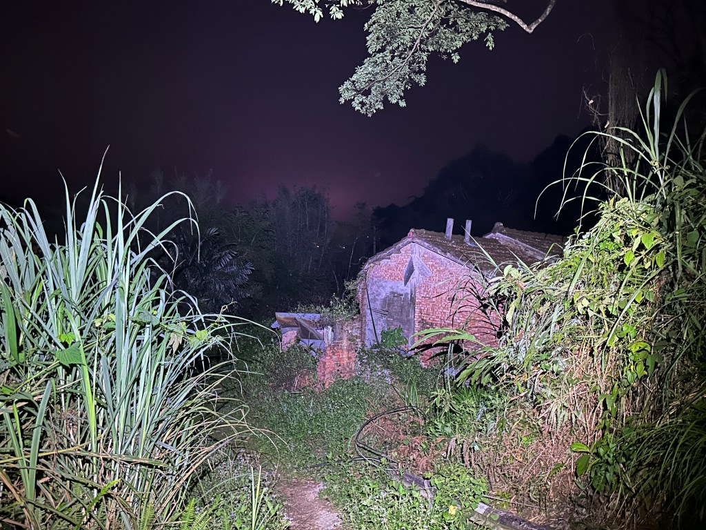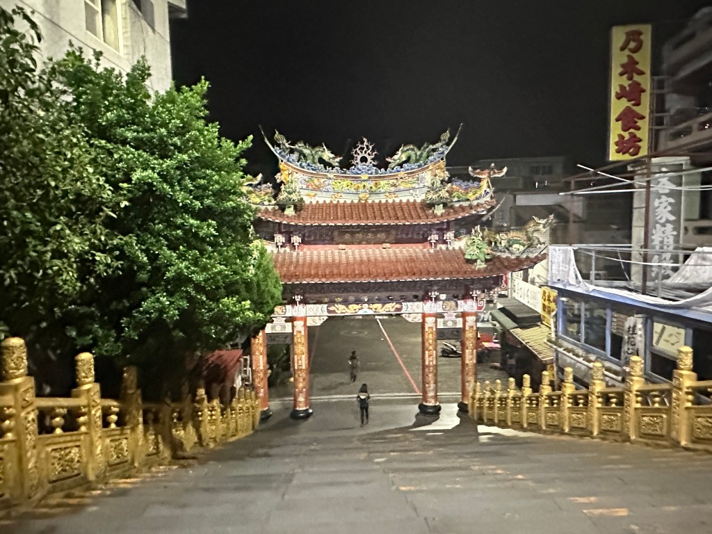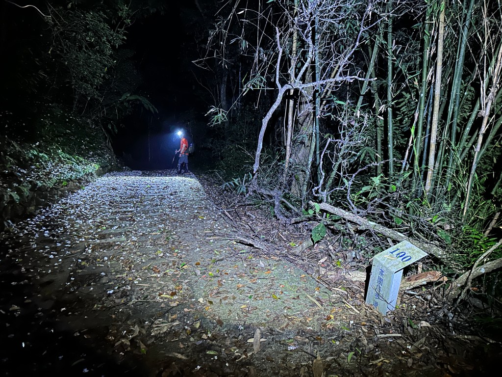 摸黑中,一路陡下經過東村山、下到林道的廢棄民宅,因為今天是摸黑狀態,才發現這個民宅並沒有廢棄,仍然有在點燈,是人家的宗祠放置處。沿著林道走一段,再度接上山徑陡上直到茶園坪山,接著就緩下接上更寬大平緩的茶園坪步道,進入南庄老街並由桂花巷前的永昌宮階梯出,再走向7-11便利超商。