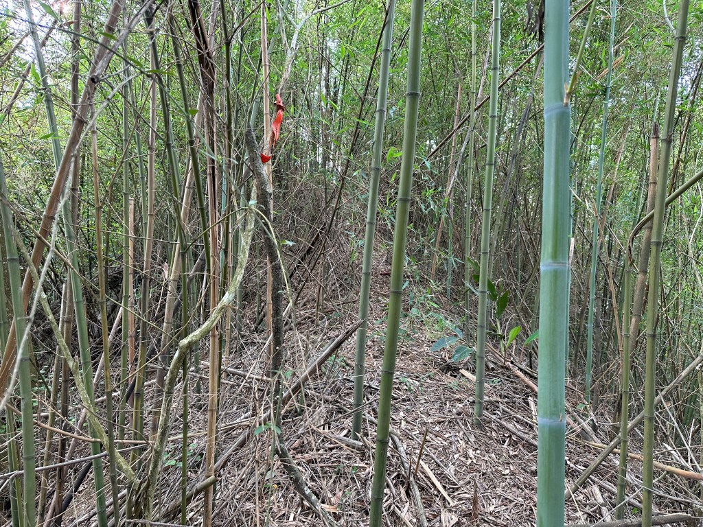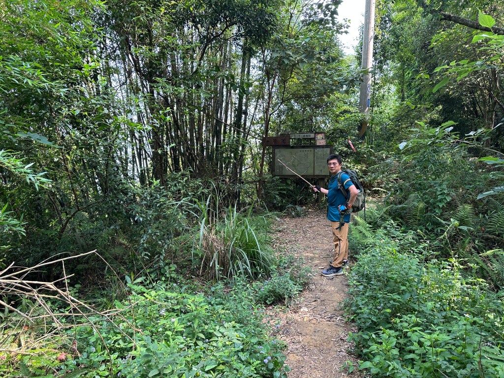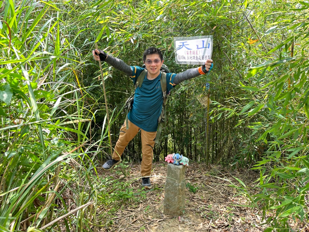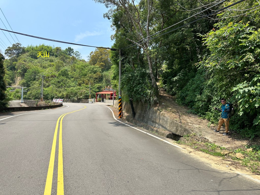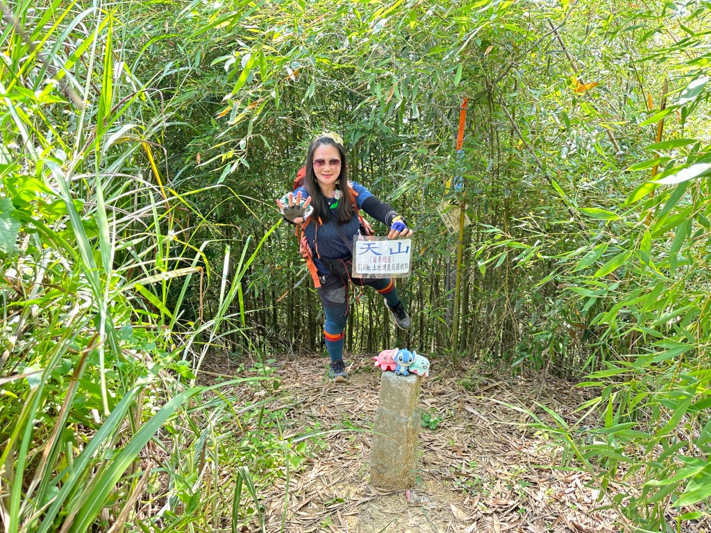 此時豔陽高照,真是,熱不思暑!來到天山前的福德祠,看著離線地圖上的位置,只差100m的距離,海拔高度僅要爬升40m,但是看不到有明確的路徑啊?一路在混亂竹林雜草中陡上走了快400m,中途後可以看到有登山隊的登山布條,但超級難走登頂前的路徑窄幅,一大堆鋒利的芒草擋路,不小心,就會割到臉、手,真的被割了不少道!所以,一路上用著木棍劈砍,再原路而回到下方的福德祠!