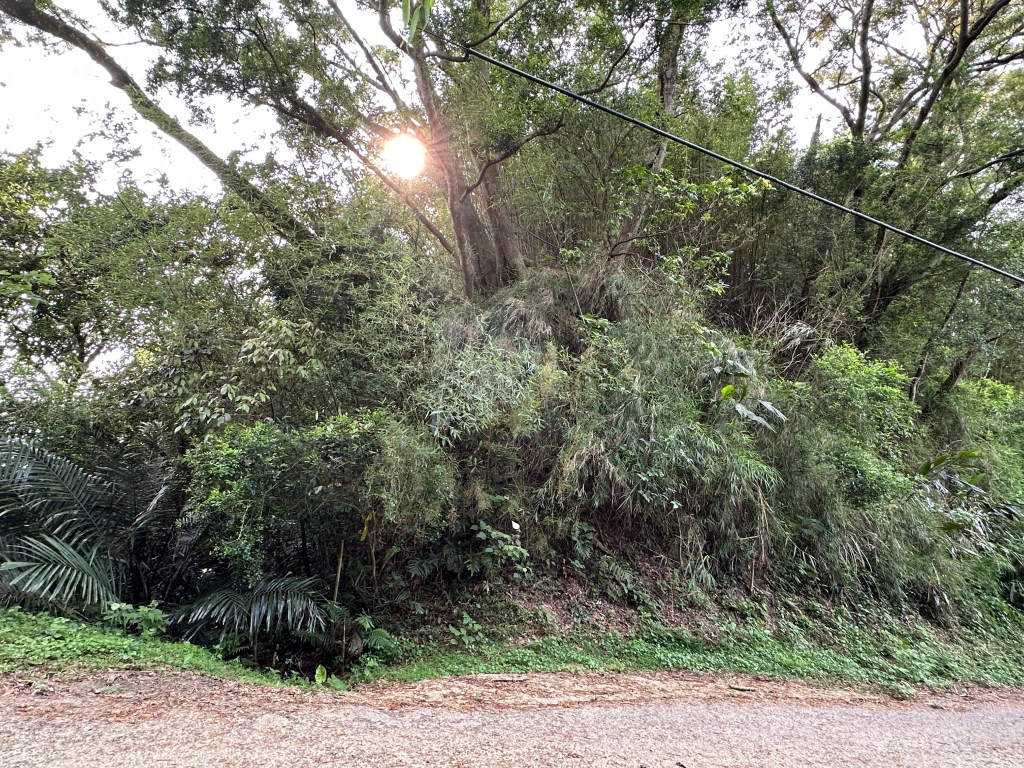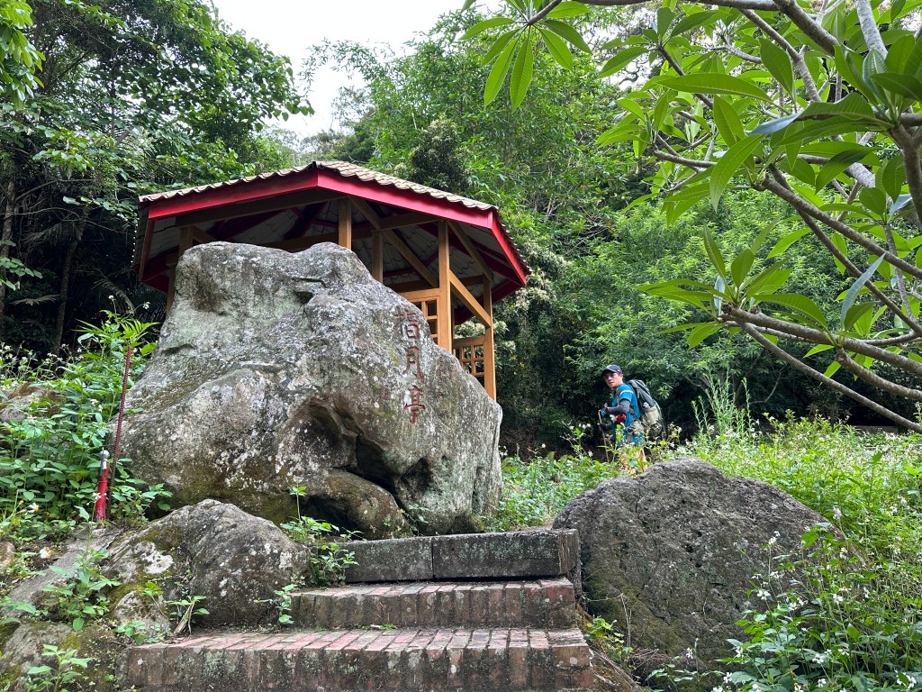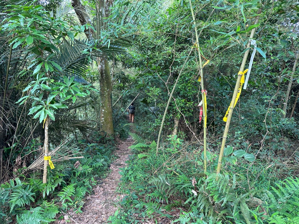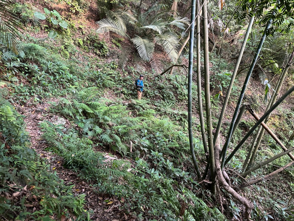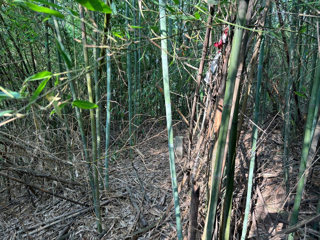 此時豔陽高照,真是,熱不思暑!來到天山前的福德祠,看著離線地圖上的位置,只差100m的距離,海拔高度僅要爬升40m,但是看不到有明確的路徑啊?一路在混亂竹林雜草中陡上走了快400m,中途後可以看到有登山隊的登山布條,但超級難走登頂前的路徑窄幅,一大堆鋒利的芒草擋路,不小心,就會割到臉、手,真的被割了不少道!所以,一路上用著木棍劈砍,再原路而回到下方的福德祠!