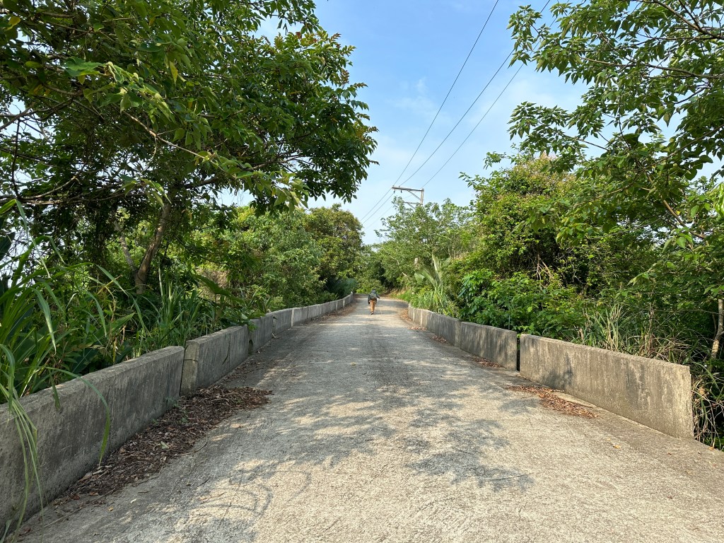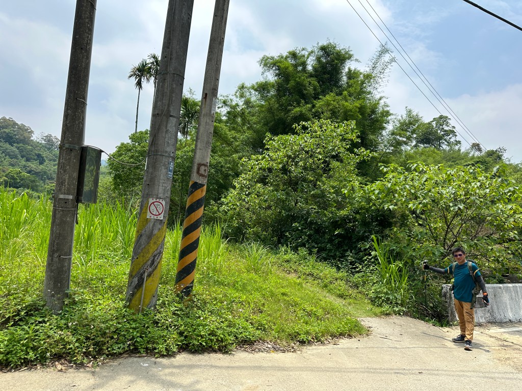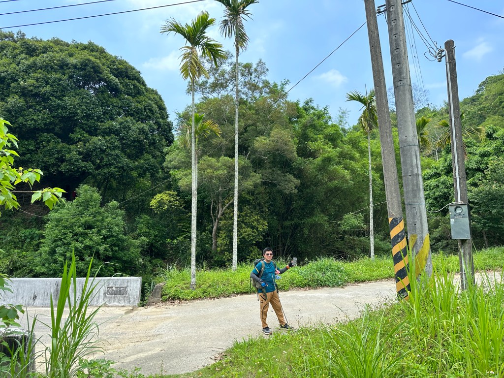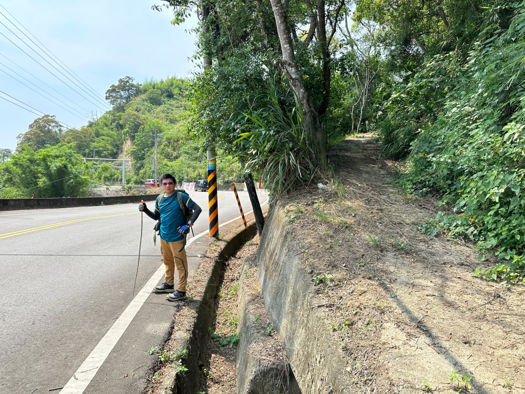 再由好樹山往枋寮坑山走,繼續踢著苗22公路,到達濟世宮的岔路(H129m)時,往左岔陡下到濟世宮,通過濟世宮持續陡下到海拔H62m的南坑橋前左轉而入。一進入細小平緩山徑,此時恰有一台摩托車也騎進來,正在好奇?順便問了一下車主陳大哥,這裡是不是有一個三角點?陳大哥馬上說,有啊!在我的果園裡!非常好客的陳大哥(@小勝哥的天然果園),還說要煮泡麵給我們吃,不行!目前還在趕路中啊!在此與陳大哥閒聊一番,沒想到再回到濟世宮已經12:30!原本預計通過天山是要在12:00前的,只好,邊走邊改變計畫。