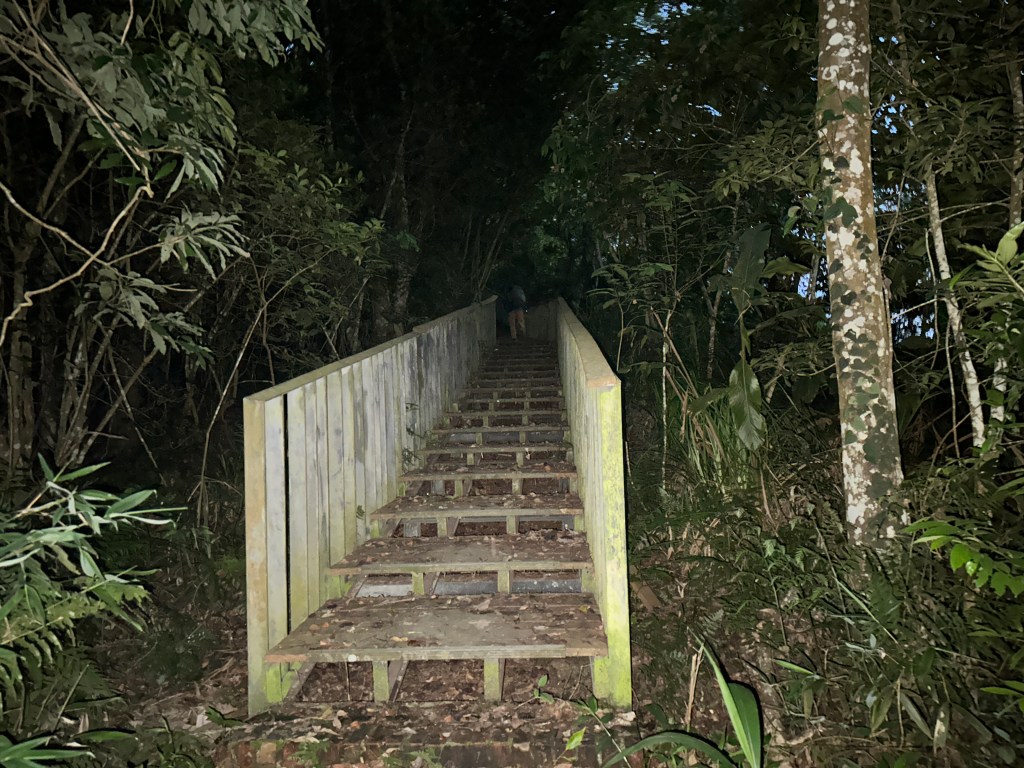 400m後接上產業道路,走200m後再度接上往蕃子寮山的北長城步道,距離上需要1K,還好這一段路段是梯田型態,陡一小段,接著平緩一段,從海拔H364m陡到三角點的H492m,這時離三角點還有500m時天色已經昏黑,拿出頭燈!接著,就看到優美寬大的木頭階梯步道,一直陡上到三角點。