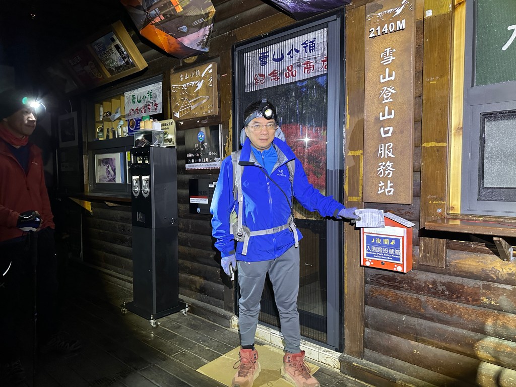 我們本次的行程中,啟程與回程都需要接駁,因此都事先有跟王小明講好接駁時間。事先在當天下午4點左右來到王小明即開始睡覺,大約在10點時起床並開始進食。出發時是在晚間11:00時搭上接駁車,抵達到大水池登山口時已經超過11:40,大伙在雪山小舖這裡上完洗手間後即啟程。