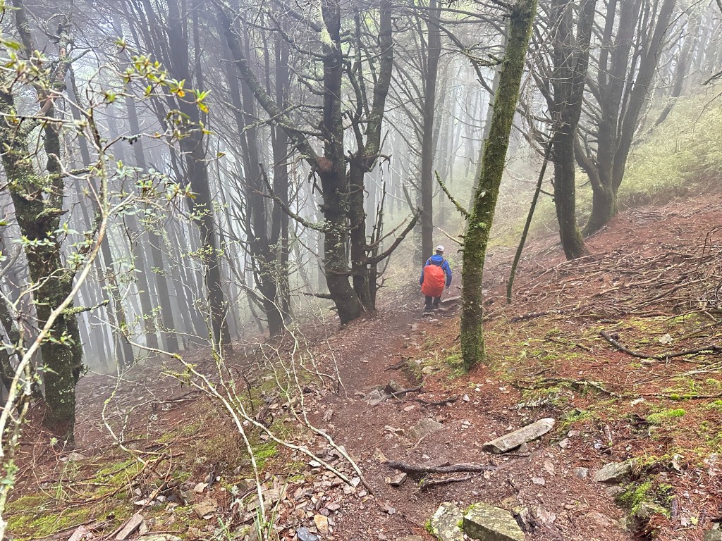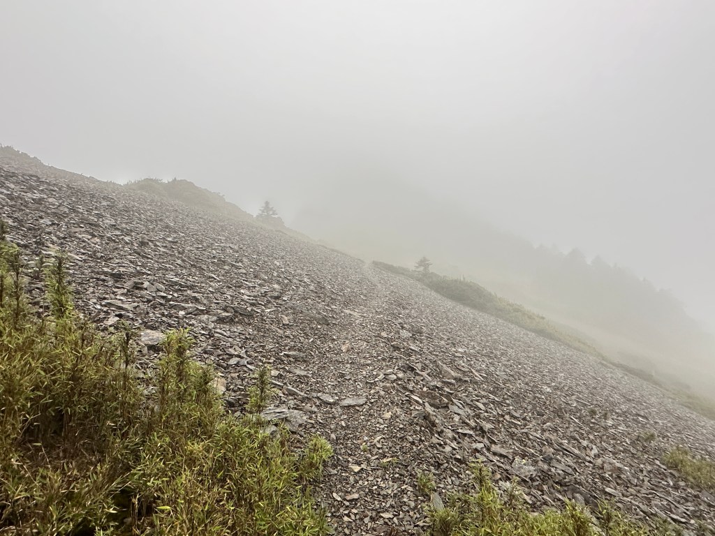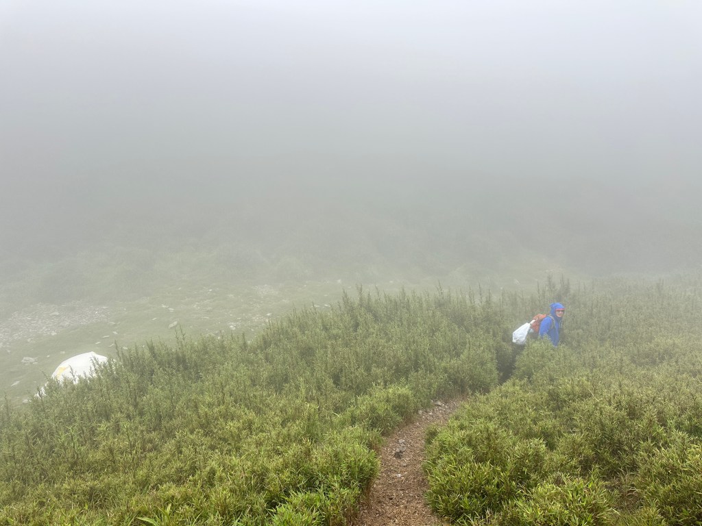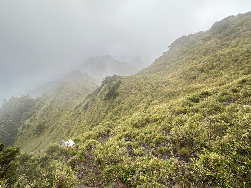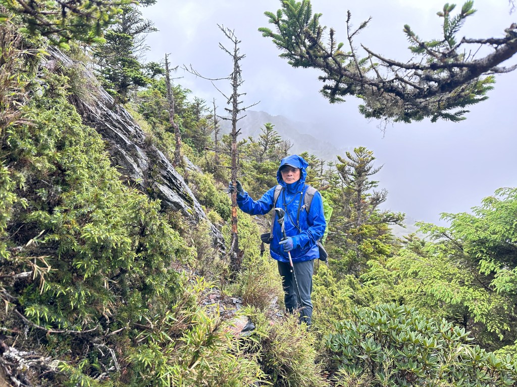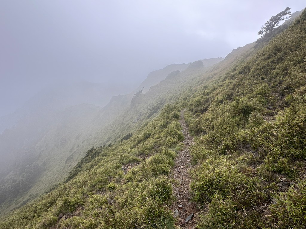 這一路上箭竹林又高又長,並且有些路段會突然有垂直的陡上陡下轉折,天氣好時,這些都不是問題,但我們在未抵達達完美谷營地前,天氣就開始轉為陰雨狀態且還一路打雷聲!霧氣也愈來愈濃,就像是在天黑狀態下,跟我們預想的完全不同?因為出發前才對過Windy及中央氣象署的天氣預報,看到的都是會呈現陰天而不會下雨。
