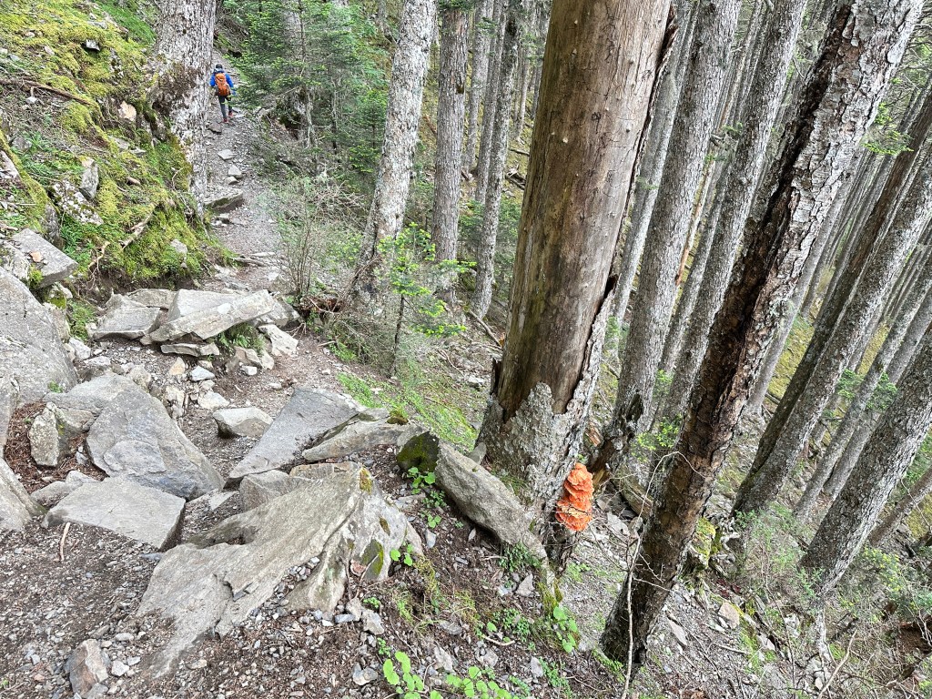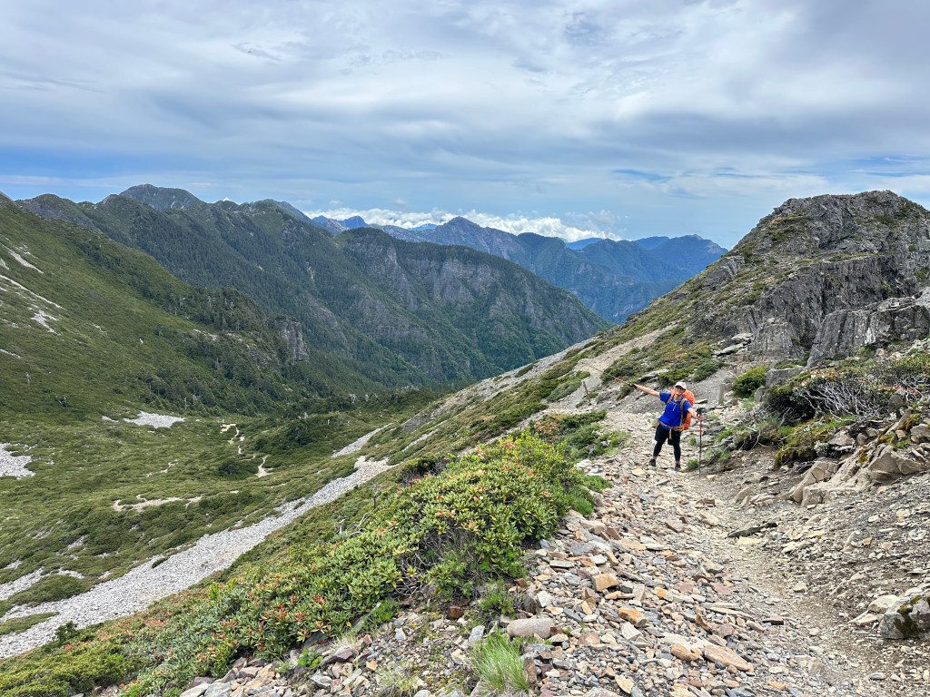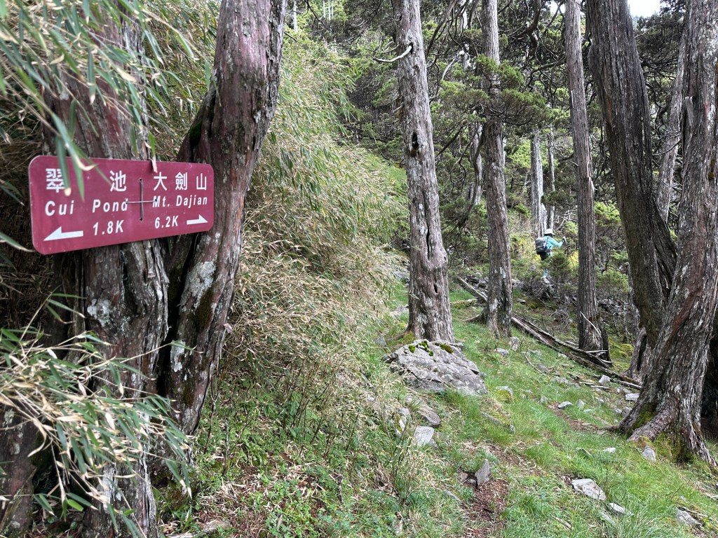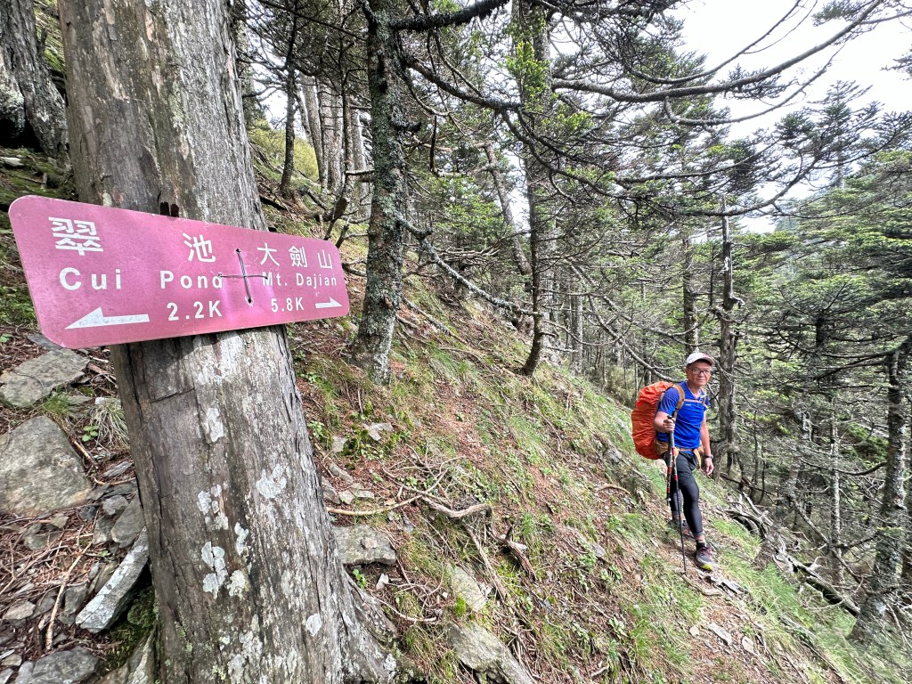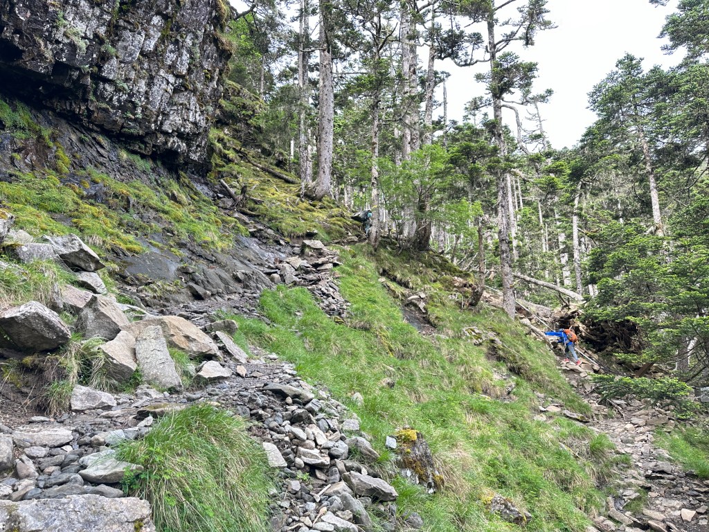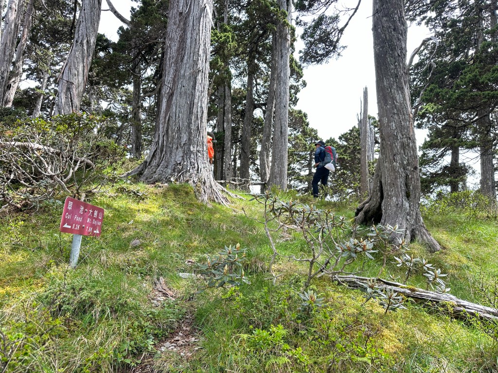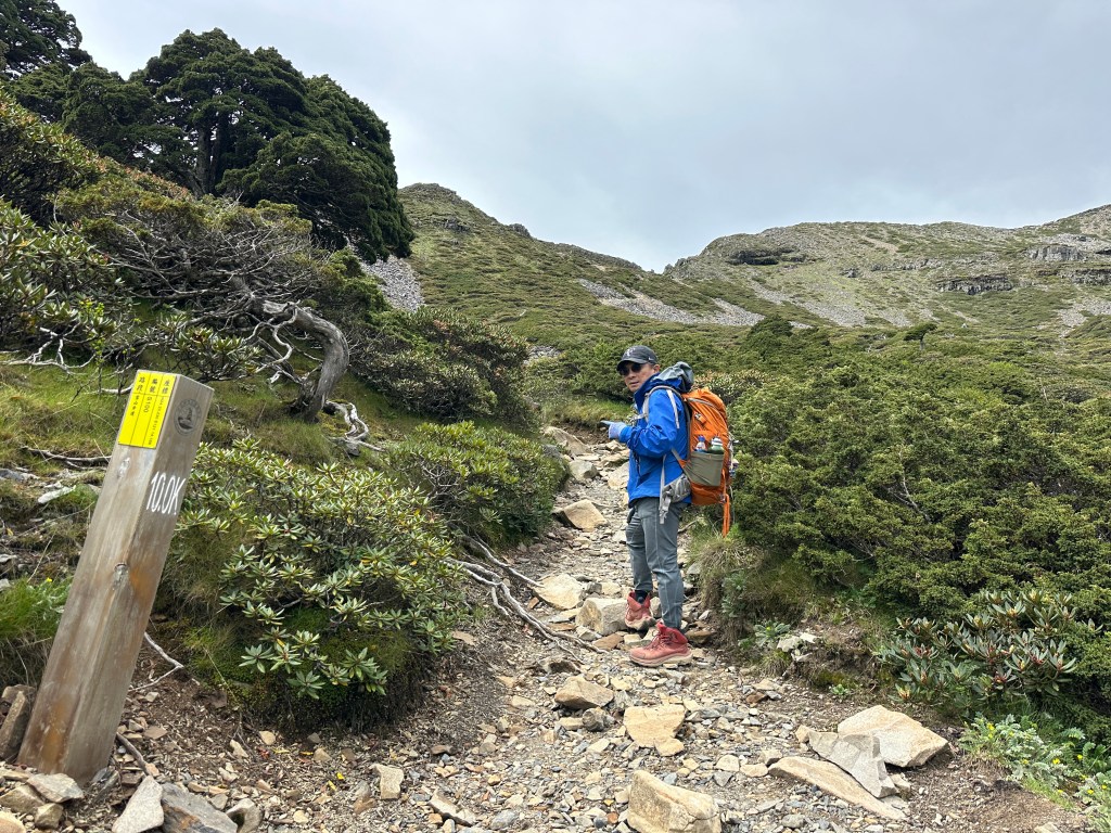 預計下午會轉為陰天,沿著步道持續走,先陡上去翠池三叉山,接著再陡下,一路上會經過8段的石瀑,部份路段的標示比較不清楚,但每隔100m就會出現一個方向指示牌,要特別注意如果走了一段時間都沒有看到里程指示牌就有可能是偏離軌跡了。