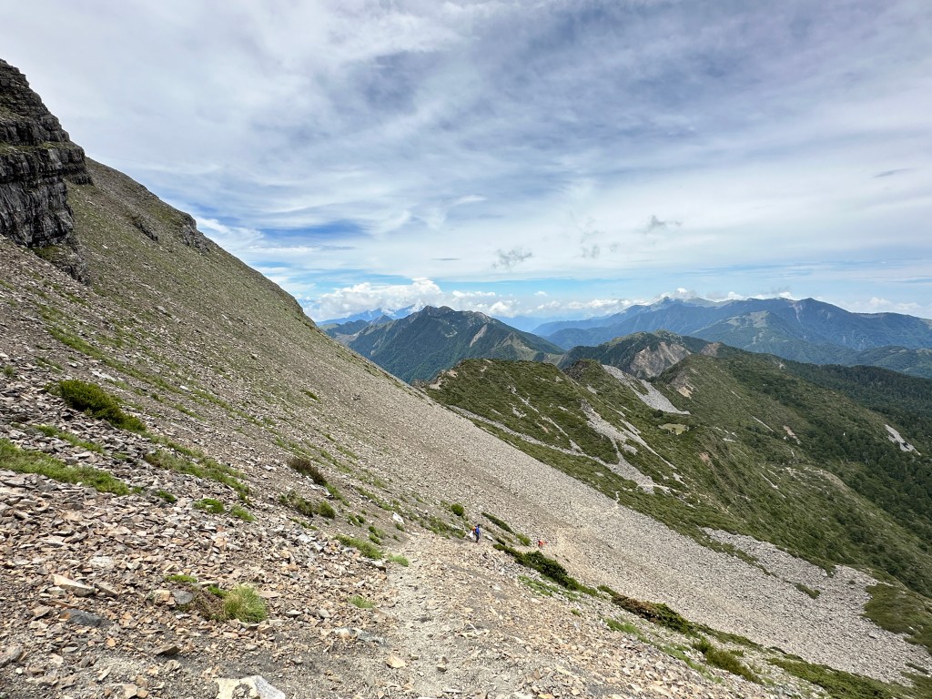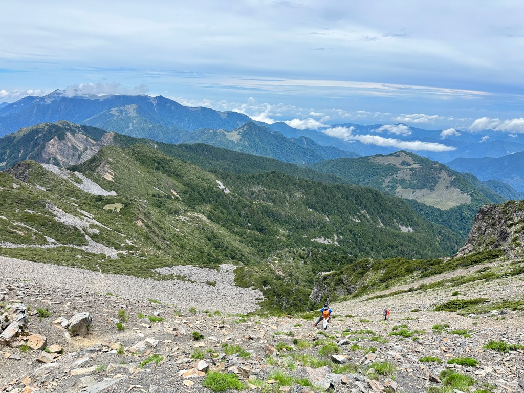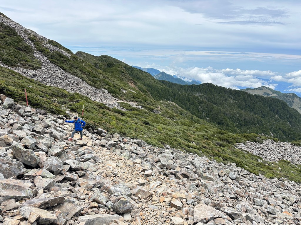 一離開大劍山,就是一路幾近垂直的岩壁陡下,還好,伙伴們的體能都還在。嘉鴻也一直提醒大伙,不能停下來,一停下來就會抖,而早上我抽筋的所有部位,還好沒再抽筋但此時也開始疼痛,兩腳有些不聽使喚,我的速度變得最慢,這時Smile反應她也已經開始在發抖,我要她先往山屋走,但她不要離開我。