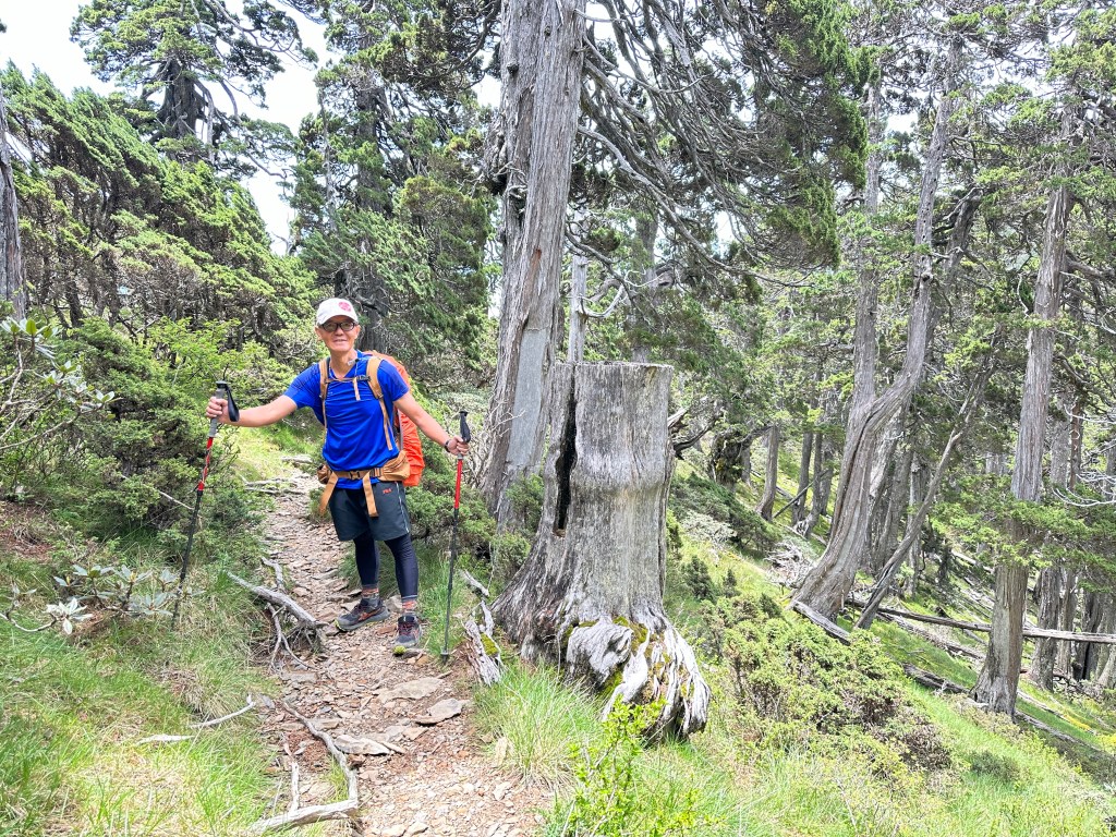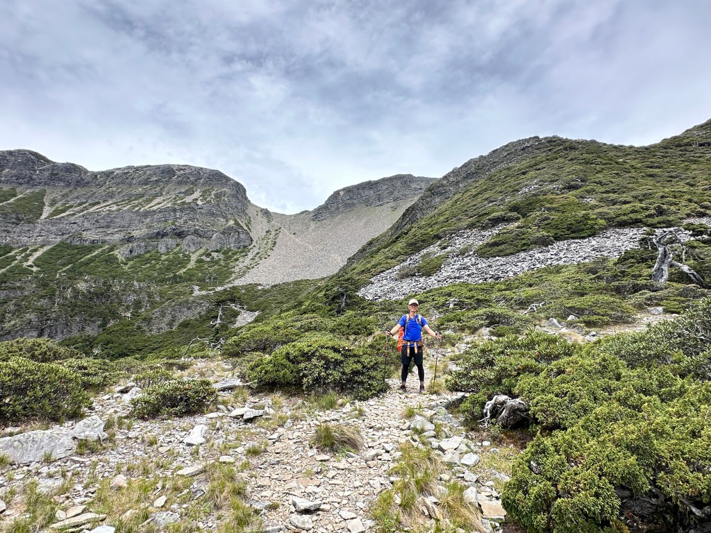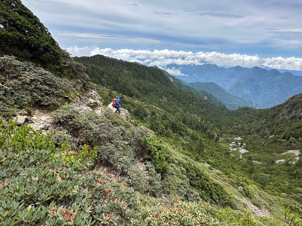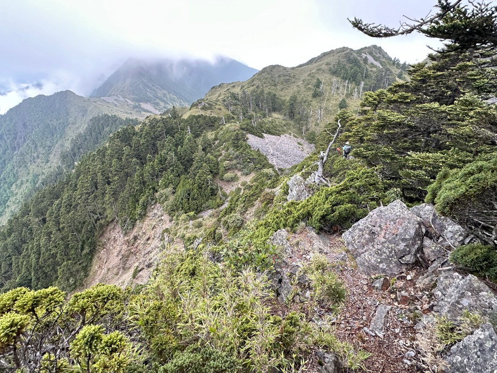 從大劍山一開始的陡下過程,大約有300m是角度很大的樹根、岩石等攀爬,陡下後再接上的路徑就是兩側低矮的箭竹林,其中經過劍南尖山腰繞這一段,右側是深不見底的地形,這一段怕自己摔跤跌倒,幾乎都是兩手一路抓著兩側箭竹林的前進,途中我也跟Smile說,你會冷先去山屋,我慢一些也是會走到,但Smile不要,就是要我(Gosen)跟著走。