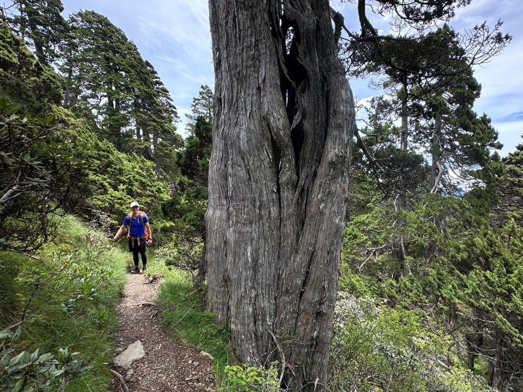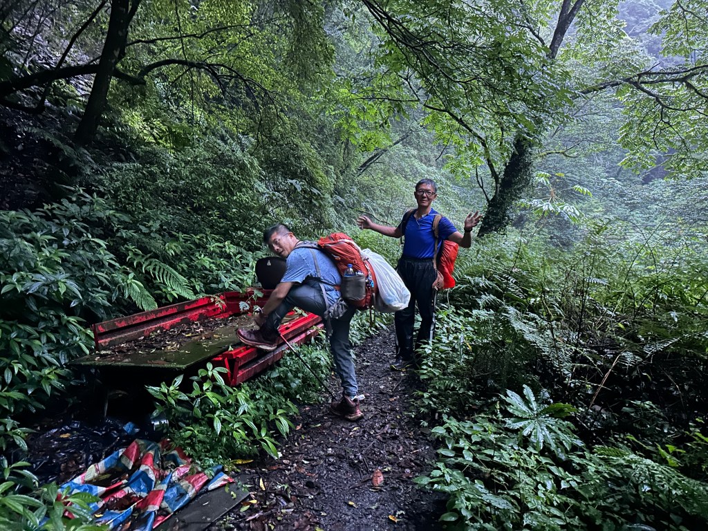 在陡上哭坡的這一段路徑上,我(Gosen)居然出現了兩腳都抽筋的現象!原因無他,因一個月前爆發了嚴重的鼻竇炎,單邊的鼻孔鼻塞且完全無法呼吸,導致連日睡眠不足,並一直在看著醫生,醫生也不知道為何會這麼嚴重?幾乎用到最強的抗生素還是沒有辦法痊癒。再加上這一段期間又去了一趟大陸麗江,上到了超過3,000公尺觀看玉龍雪山的雲杉坪,又逢大雨一直有感冒的感覺。這一個月的體能下滑太多,沒想到現在就開始反撲。