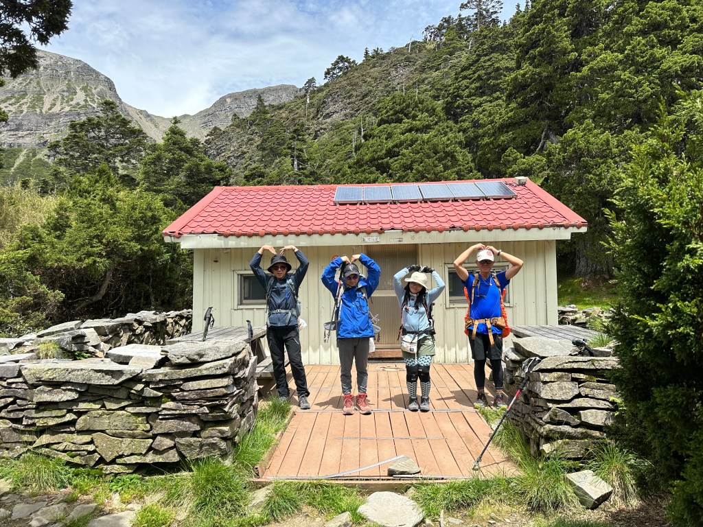 幻燈片:大伙決定在此吃午餐!此時也有一位山友正在山屋裡面補眠。