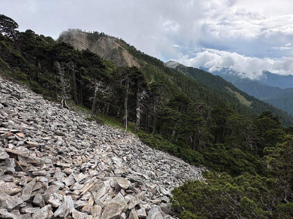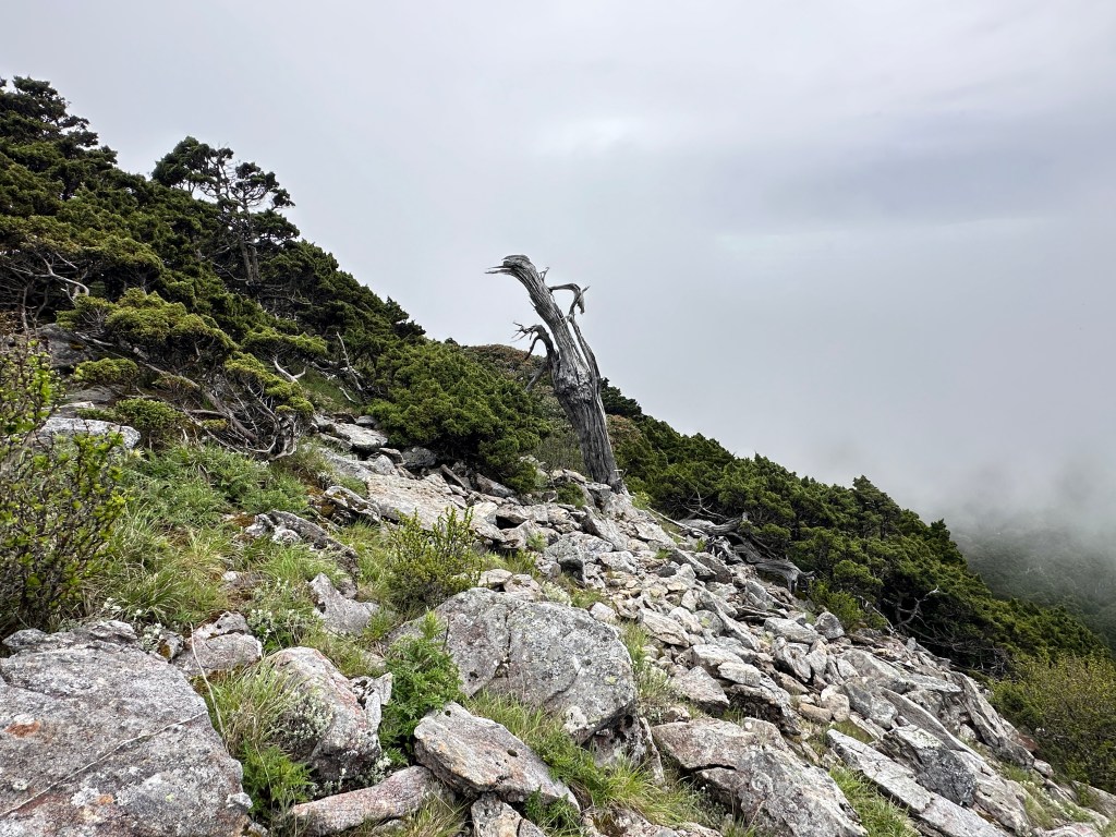 看到前方獨立的玉山圓柏,注意!要即刻往右陡下,陡下後左彎繼續沿著石瀑區走