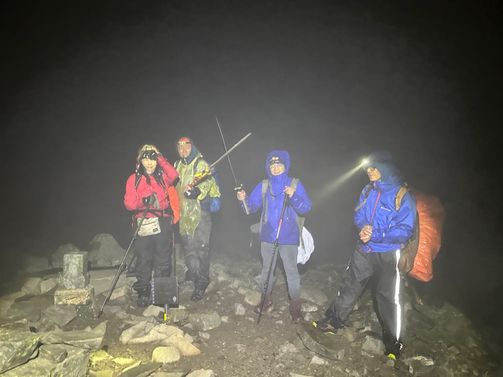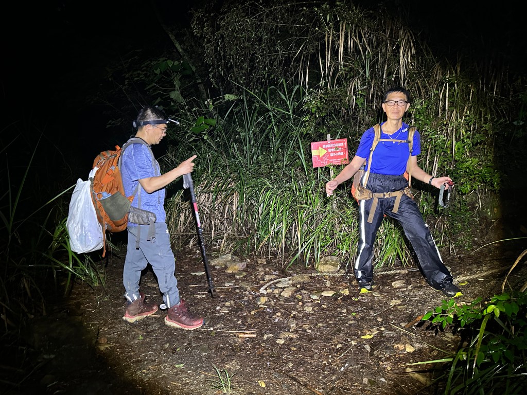 最後,發現路線在最右側的方向,又是由Smile先發現到!登頂後,已是晚間11點,而且,5人都已經在此狂風暴雨下待了超過7小時,再好的雨衣褲也都逐漸有浸濕現象,也開始讓我們處在失溫狀態,嘉鴻、Smile也開始表示有發抖現象,想活命,就一定得要往還有3K的油婆蘭山屋內先去避風雨。