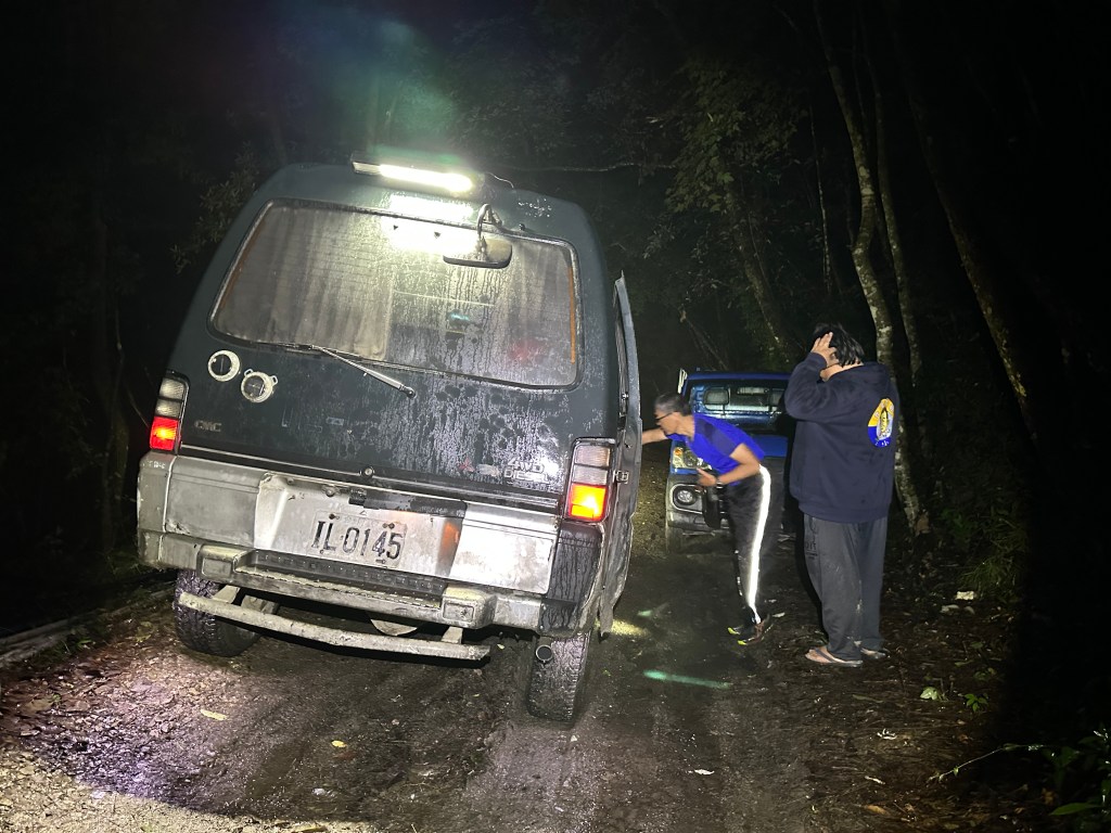離登山口前0.3K開始之字型陡下,下到登山口,再回拍這0.3K聳入雲間的天梯。接著,沿著松茂林道走約4.9K,其中,有一段陡上高繞再陡下,需陡上將近50m的高度並再度陡下50m,還蠻辛苦的!直看到,王小明接駁車亮著頭燈等著我們,原先的辛苦皆轉換為特殊的體驗!
