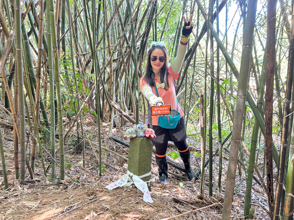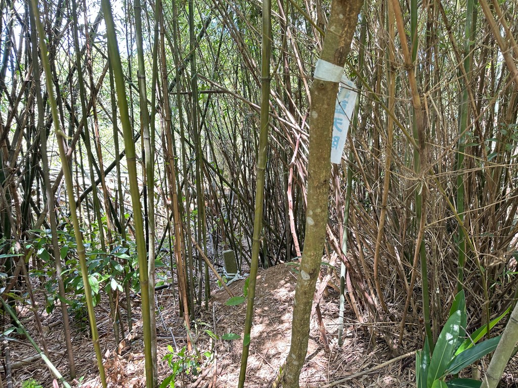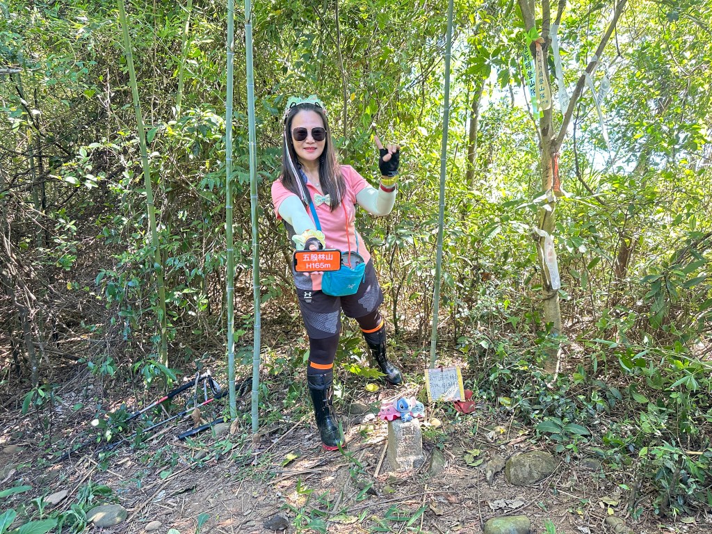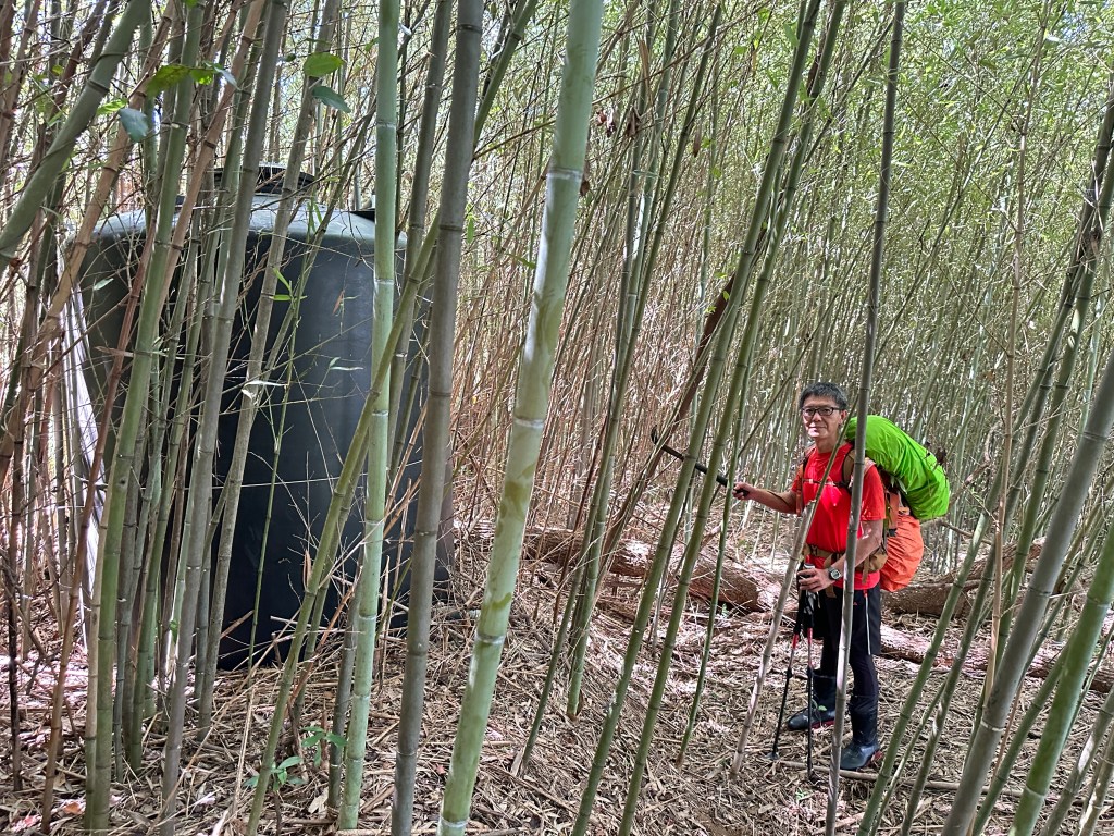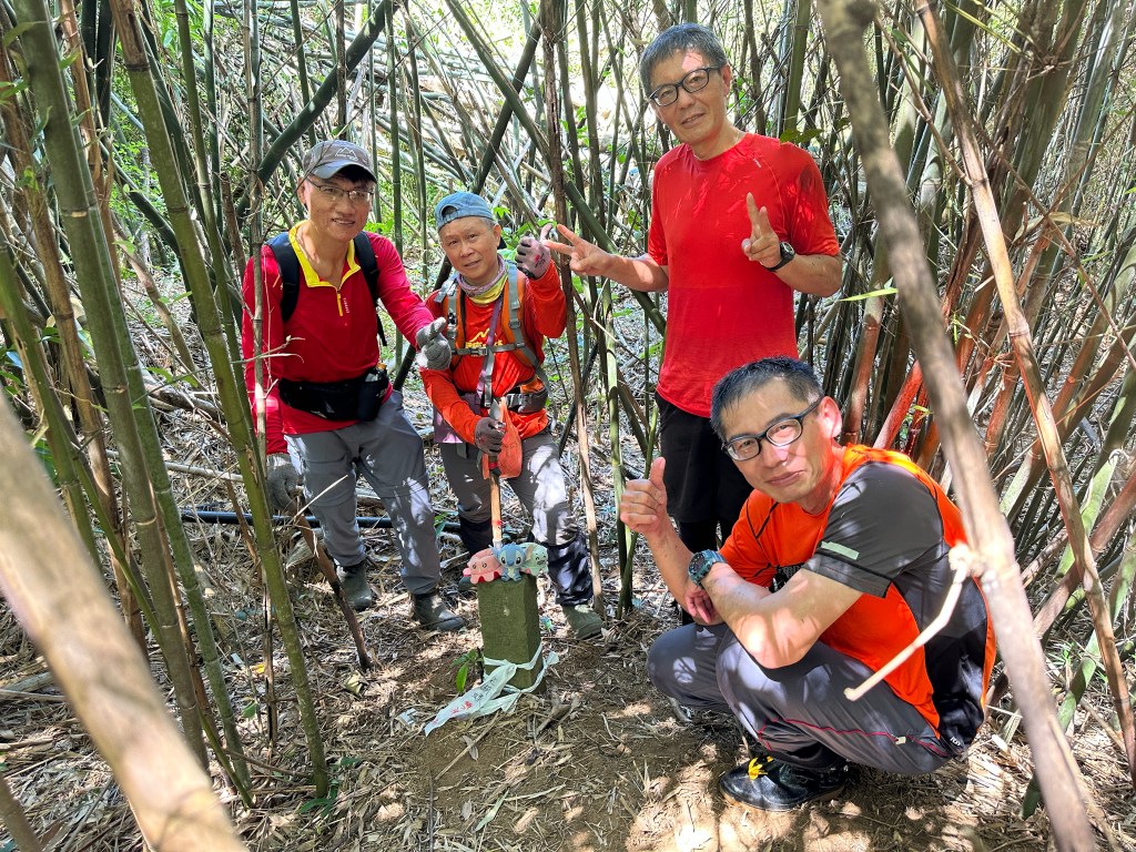 通過五股林山後一直到燥坑山,距離有1.4K ,就完全是探勘的開路型態,在離線地圖上並沒有這條路徑軌跡,這一路上都是藤蔓,除了Smile,四人一路沿著稜線砍除而行,速度頗慢,因為需要整理的雜草藤蔓還真不少,走一小段,就看到了新竹州水利第5號三角點!劉大哥很興奮的說,這個三角點是很屬於古老的三角點,還能保存到現在真不容易!