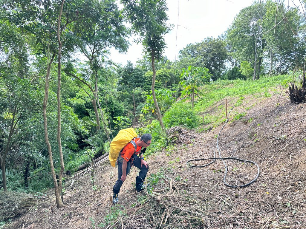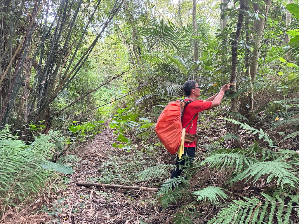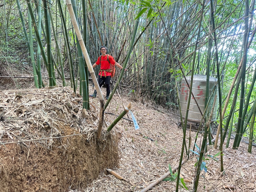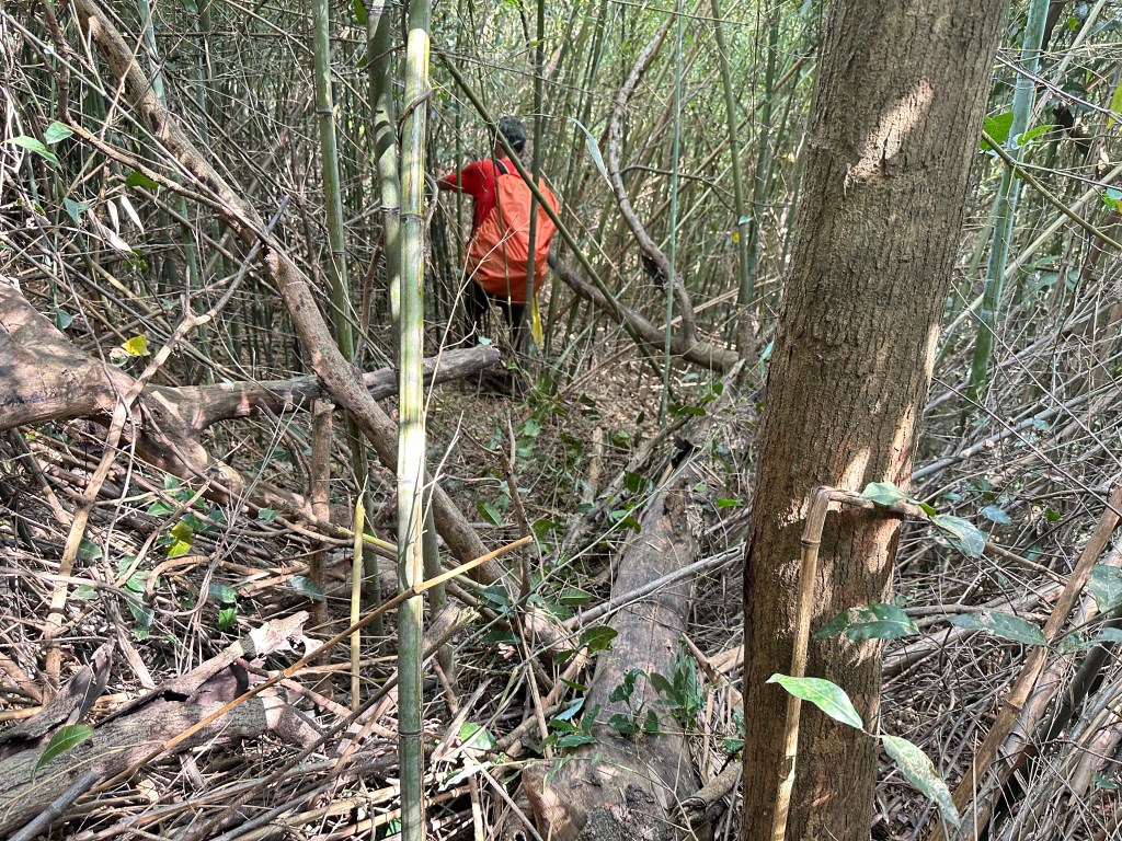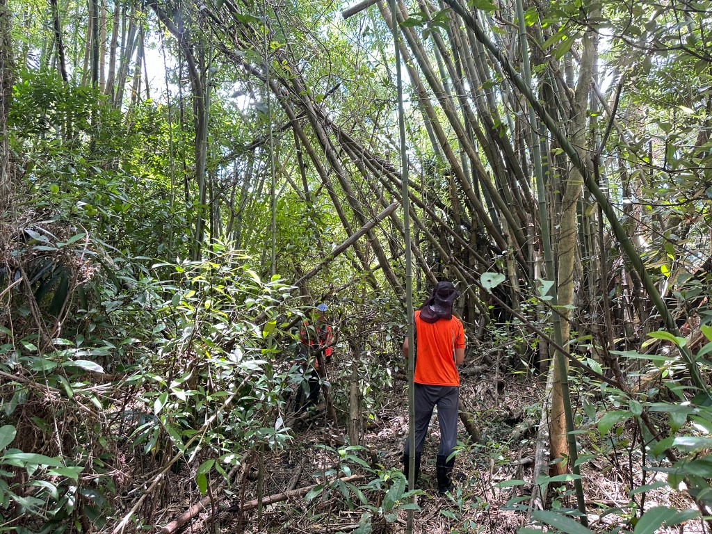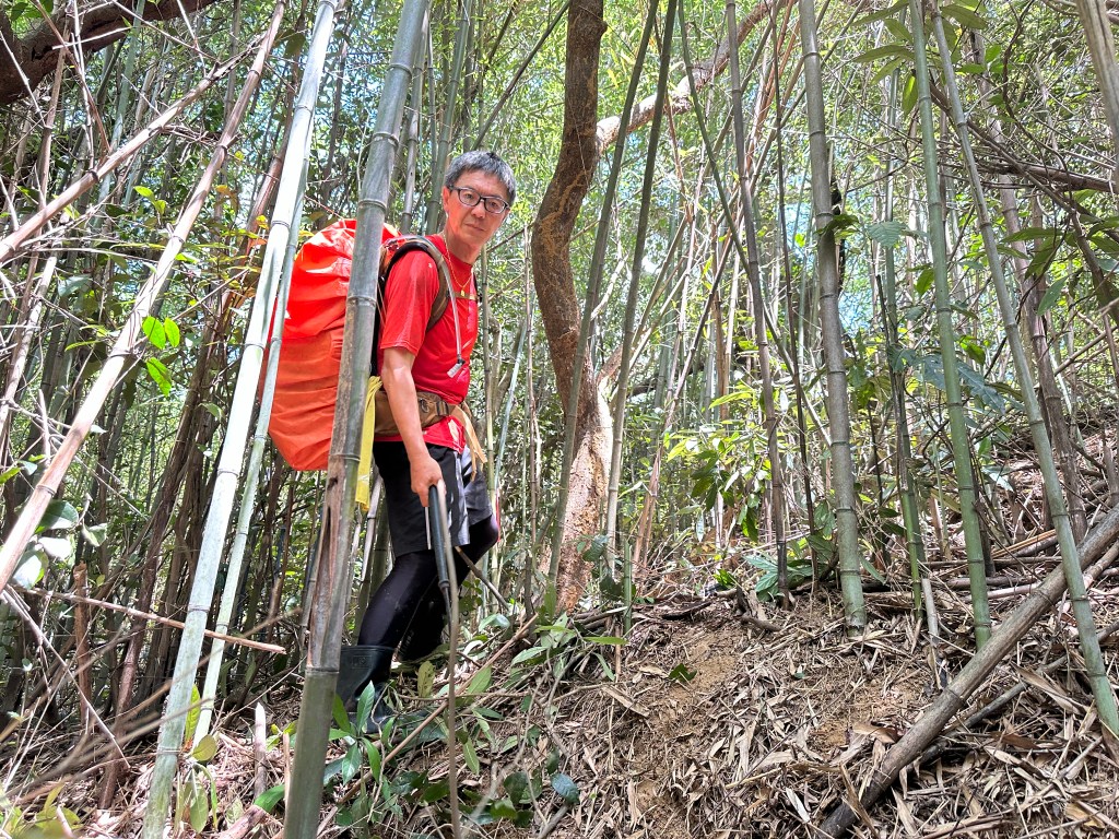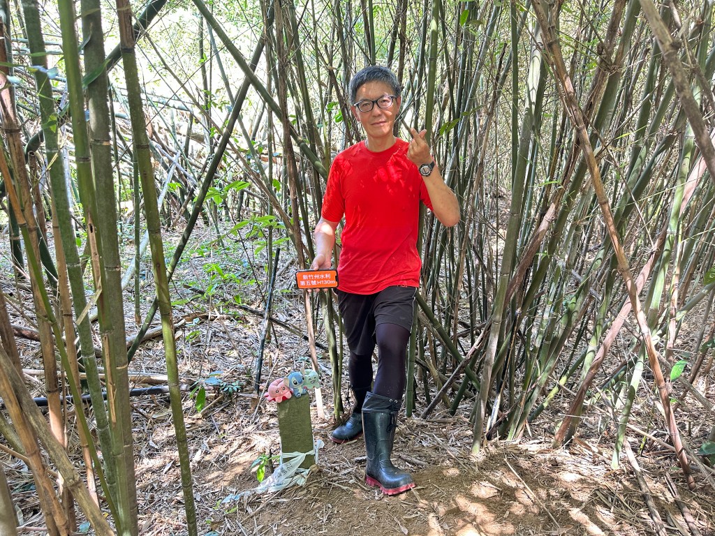 我們將汽車停在距離五股林山登山口約200公尺距離的光明園幼兒園,這裡的路邊很好停車,走200公尺開始由五股林山登山口起登,劉大哥跟溫大哥兩人在通過登山口的鐵門後,即將路徑給砍除出較大的腹地。走到五股林山的距離很短,爬升一小段,都是走在竹林中,從登山口到五股林山這一段路徑不錯,但倒竹偏多,一路上我們也將倒竹給處理了一下。