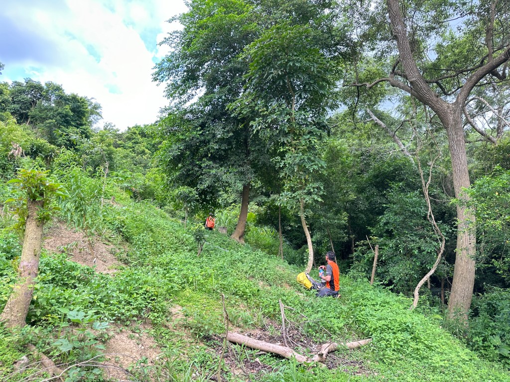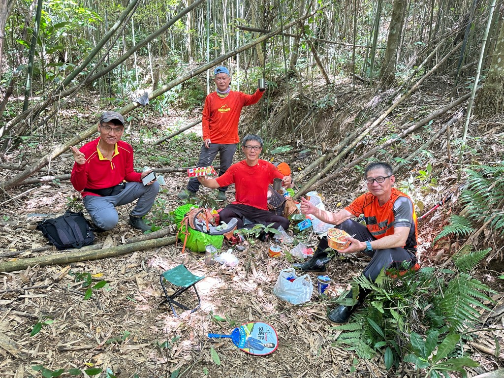 中午,先偏離稜線找一處平坦處吃午餐。下午,四位壯漢繼續砍除,一路陡上;中途,決定兵分二路,一路沿著稜線砍,一路沿著腰繞走。後來合兵一處皆走稜線路,在下午三點半後打通連上了燥坑山!