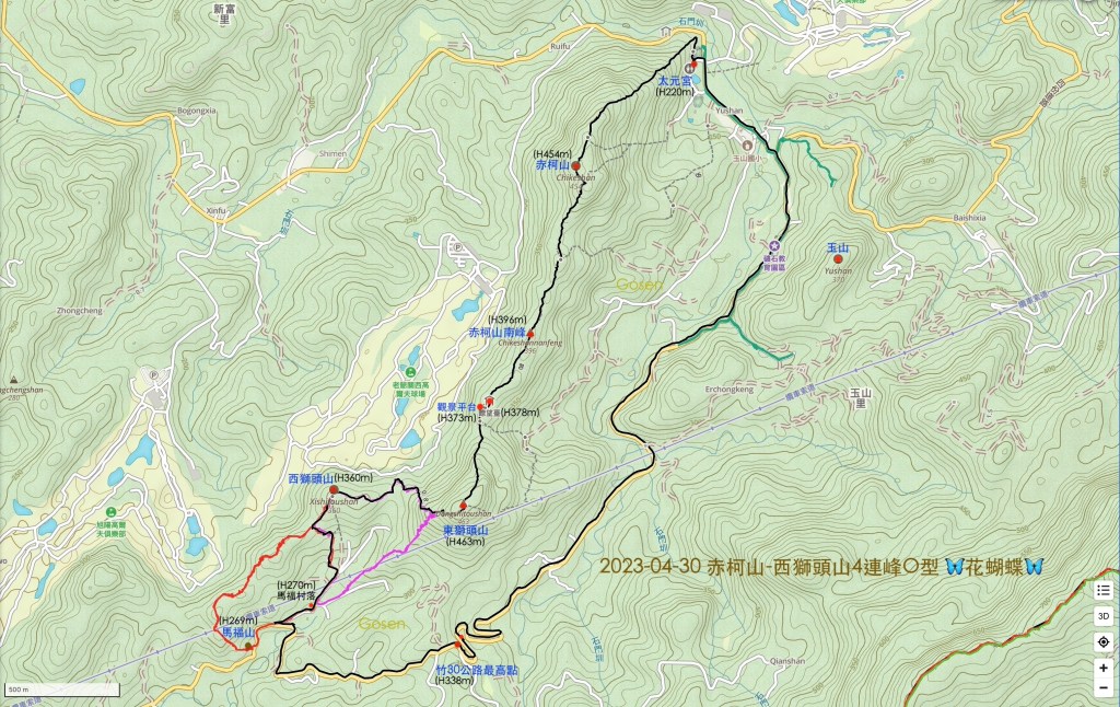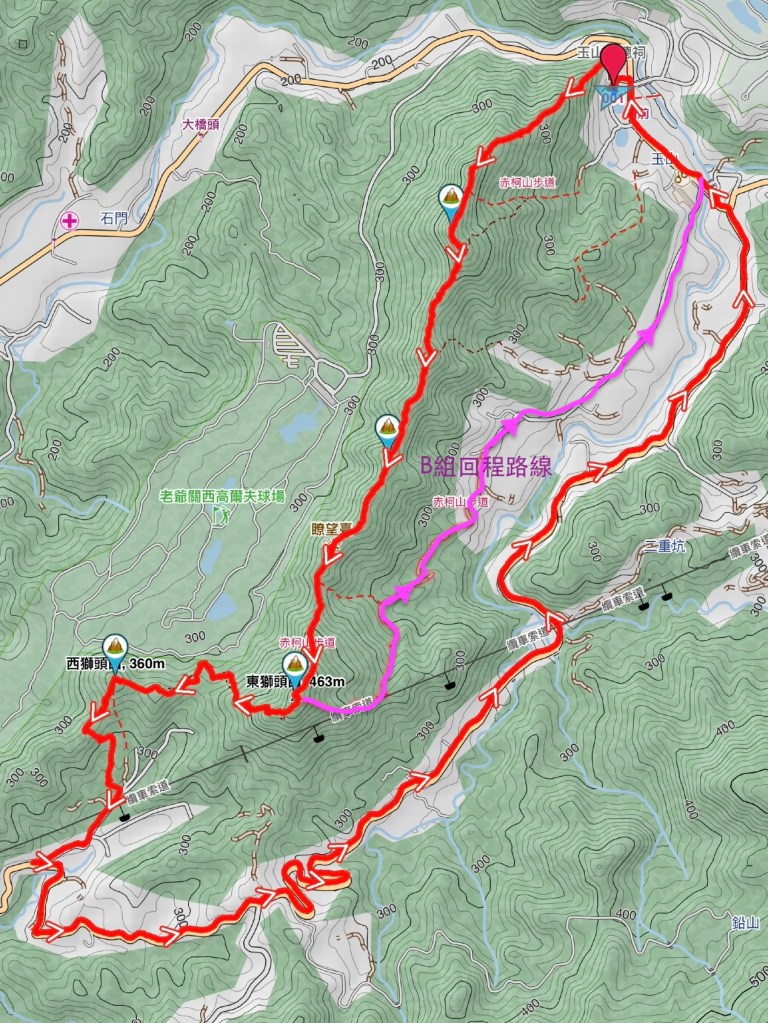 B組由東獅頭山後就直接由左側岔路下山,接上赤柯山步道產業道路,再由玉山國小產業道路一路走出玉山國小而回到太元宮。