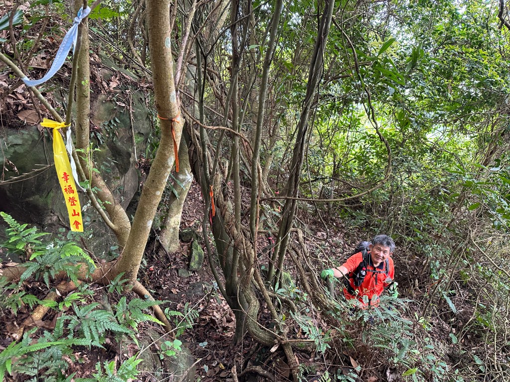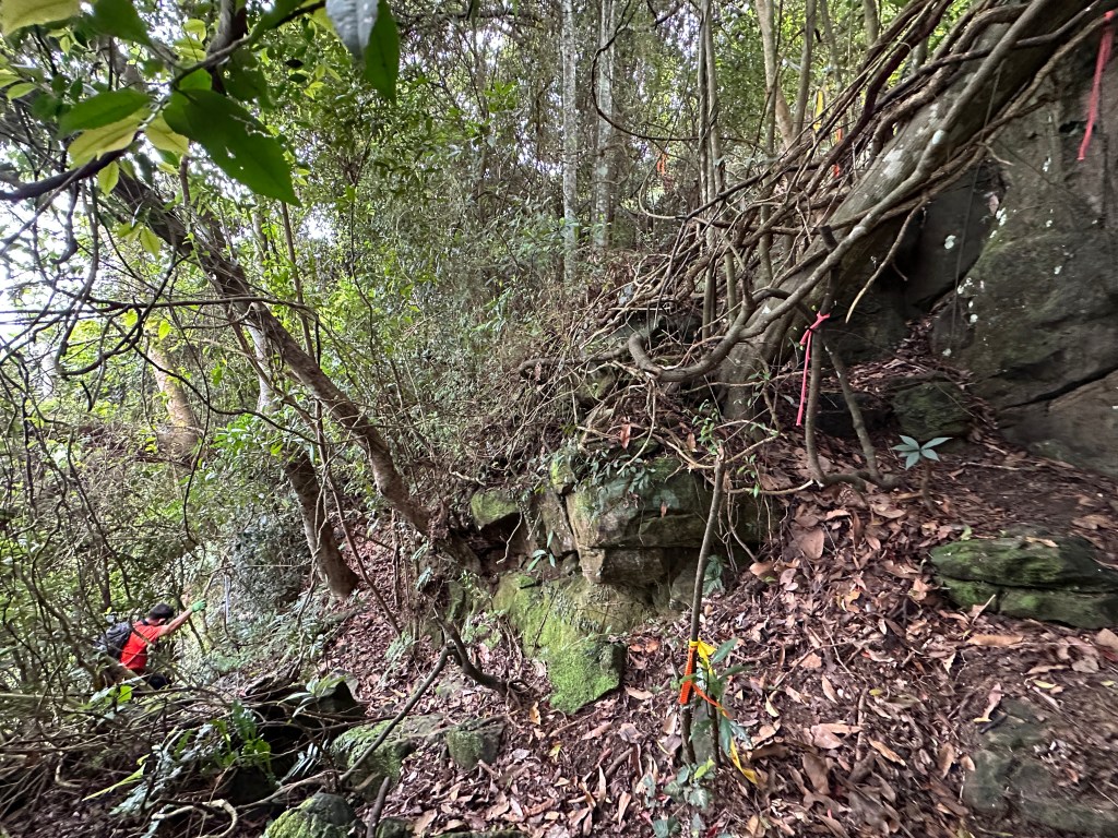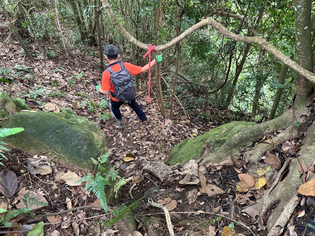 幻燈片:又一段沒有繩索的陡下,要自行利用樹幹植披來手抓。