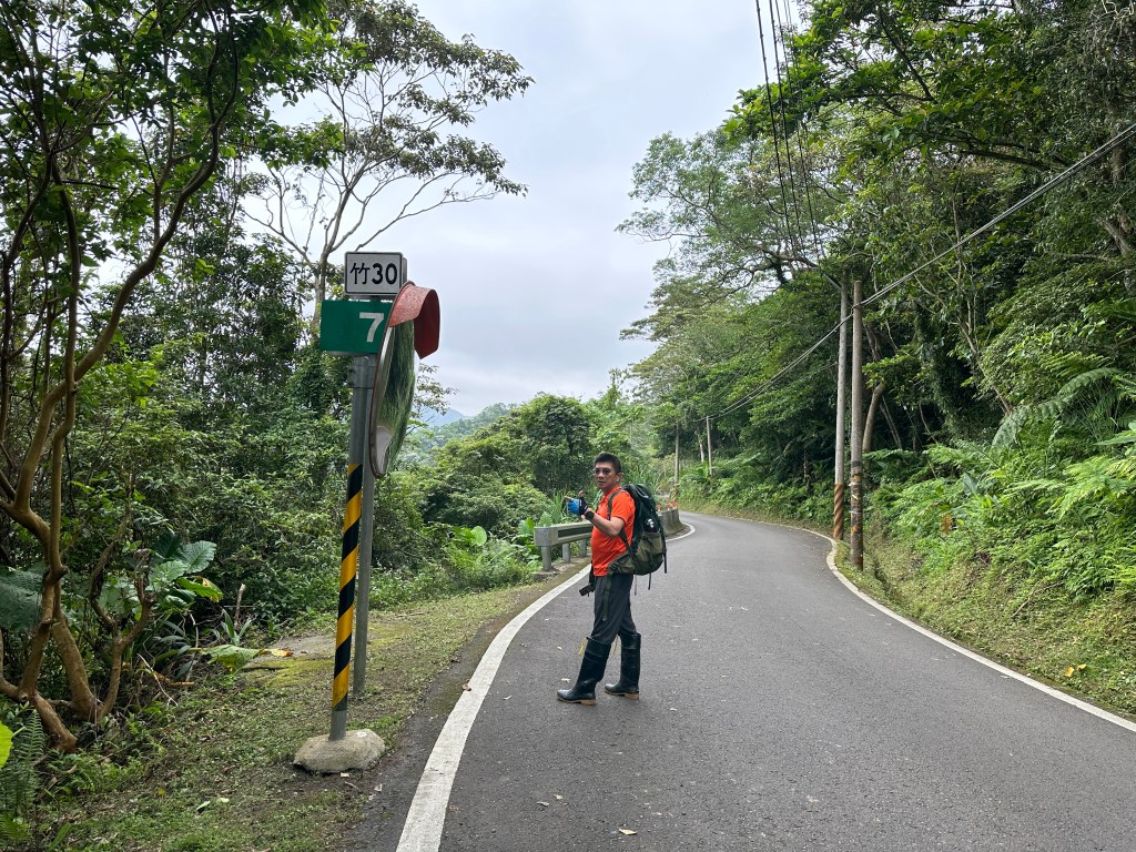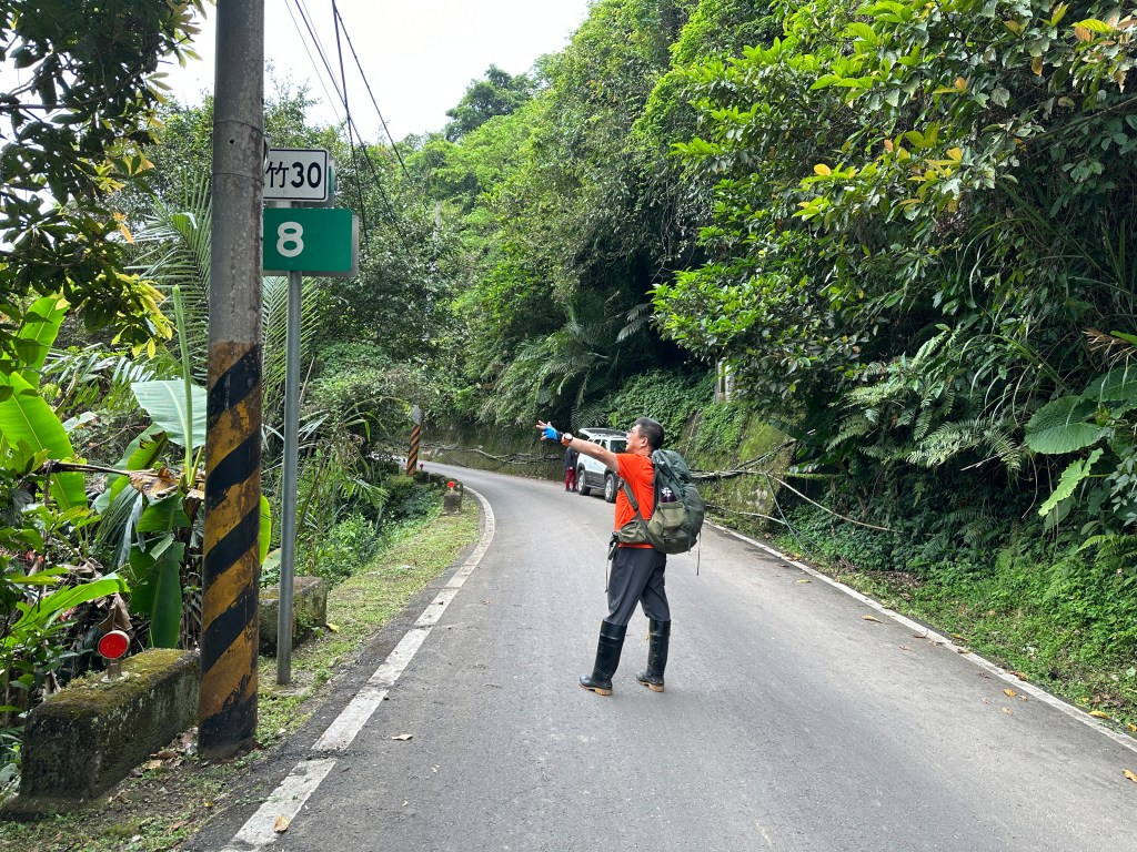 再來,離開西獅頭山,要硬切一小段不好走的路徑陡下,接上水泥路徑,再接上柏油路徑,接著,接上竹30線後,如果要O型走公路回去,還要由竹30線11K走回到竹30線5.6K的太元宮!結果一行三人走到9.6K左右時,就看到Joe開著汽車過來載我們,我們請Andy哥上車,而Smile與我(Gosen)則繼續自行雙腳接駁。