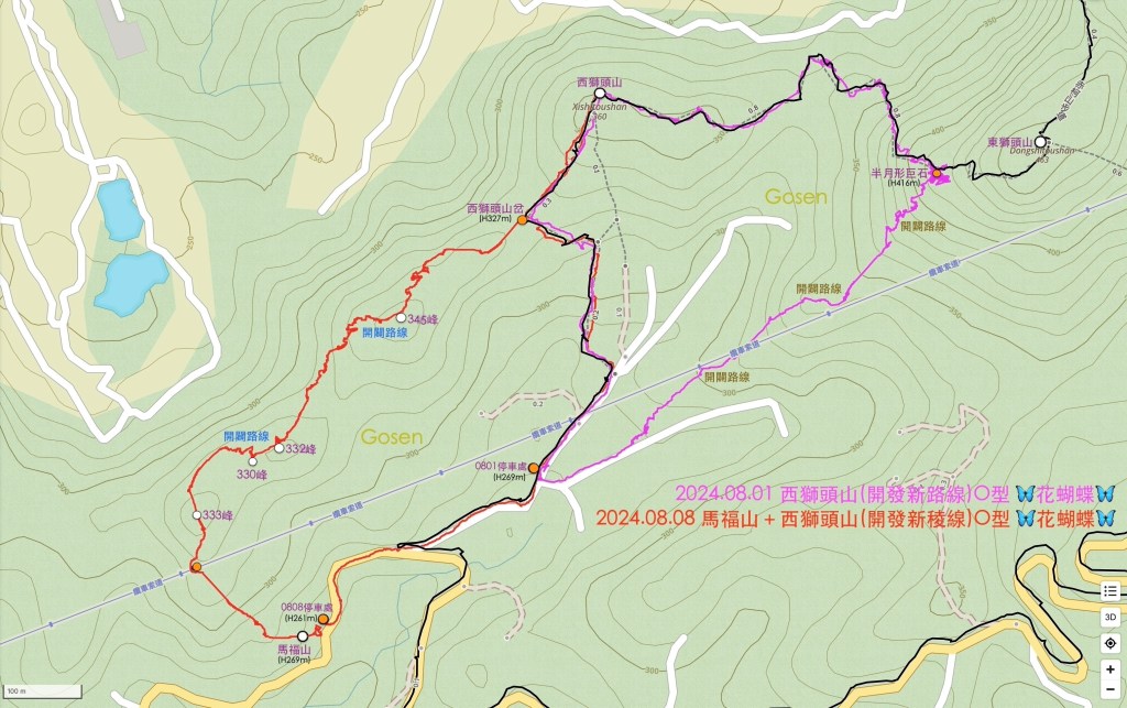 底下列出,在2024年8月1日與8月8日兩次,桃園鐮刀隊與我們花蝴蝶伙伴一起開發了西獅頭山的另外兩段的路線,記錄如下: