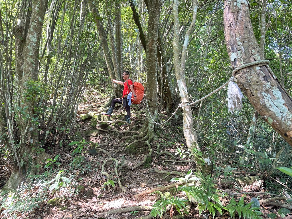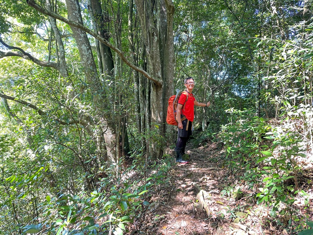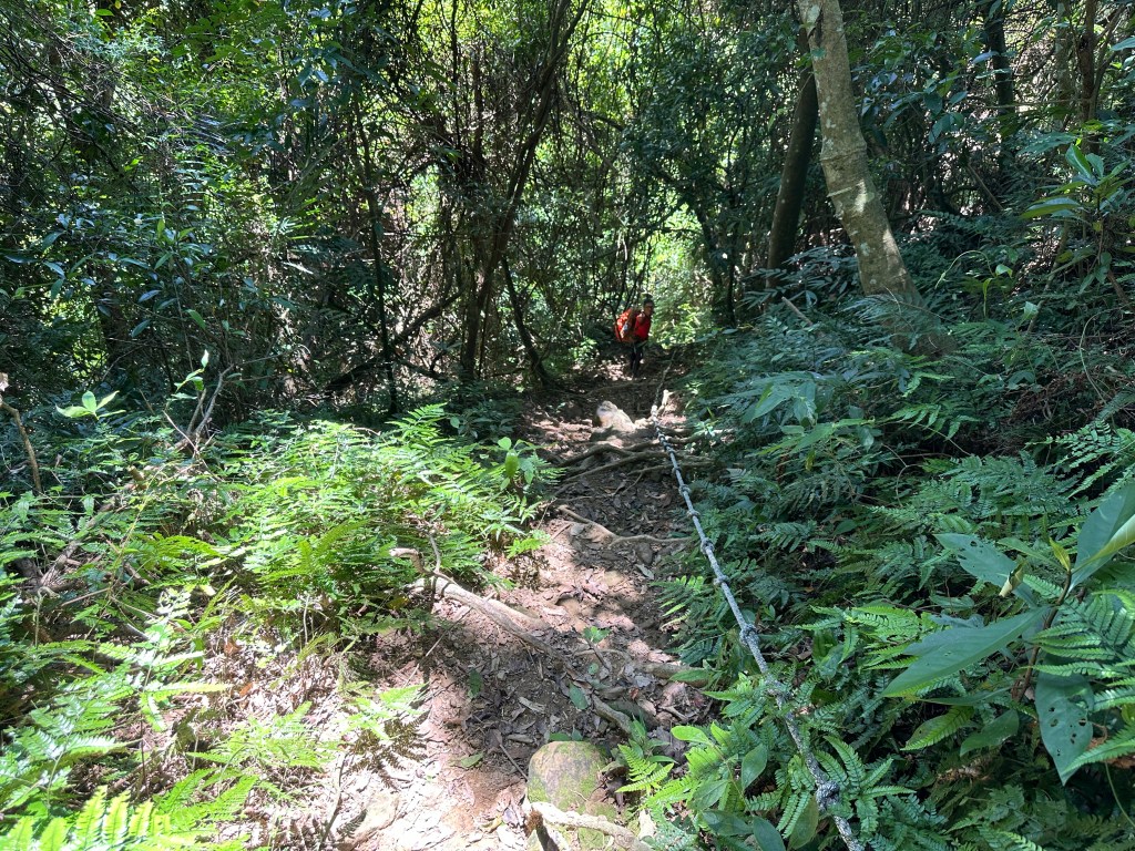 Jun與Smile則往右前方走,要在300m的距離裡直接陡下由H460m陡下到H350m,這一段陡下過程會經過先前去開新路的半月型岩石岔,整個陡下的斜坡很滑,部份路段有繩索,但部份路段沒有繩索就必須拉著藤蔓輔助來陡下。路徑平緩後,會再度遇到捷徑路與傳統路岔,Smile兩人走捷徑路,這一區域的路線Smile在這一年就來了不下5次,是蠻熟悉的路段。