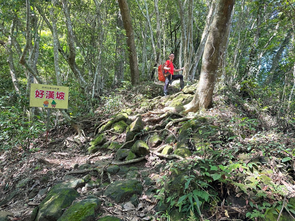 早上9點,Jun與Smile兩人由太元宮起登,由太元宮右側的金爐方向走,金爐右側就是赤柯山登山口,隨著登山路徑逐步左彎陡上,很快就看到「好漢坡」的立牌!到底是「好難坡」還是「好汗坡」,真是汗如雨下,陡上後上了稜線就會抵達赤柯山。