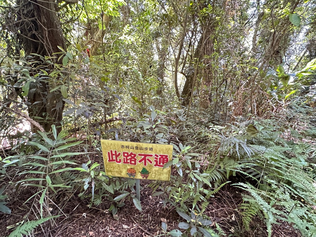 離開赤柯山續往赤柯山南峰走,右側會出現一處極美的展望點,可以看到下方平緩地形上的高爾夫球場。再來就直接陡下,陡下中的左側會出現一個「此路不通」接上平緩的稜線路後,接著的稜線路上高低起伏不大,經過第二個「此路不通」的黃色立牌,看得出左側山坡陡下應該存有一條路徑在,只是都沒人來走已經回歸自然了。通過「此路不通」後,再度陡下一段,平緩後持續往前一段當看到大倒木時,即抵達赤柯山南峰。