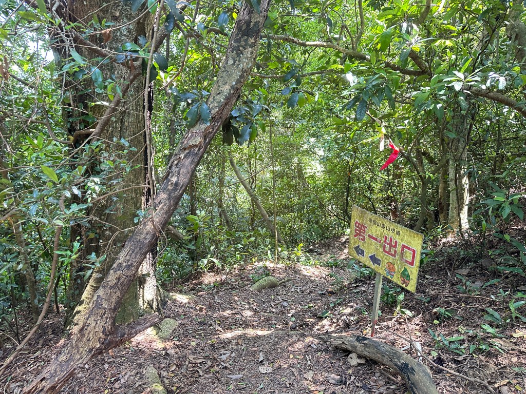 由「觀景平台」回走接回常規路線,走一段就會來到左側是「第一出口」的岔路,可以由此「第一出口」左岔陡下接上赤柯山步道而走回太元宮。通過「第一出口」岔後,接著就是直接陡上高度100m後就可以來到東獅頭山。