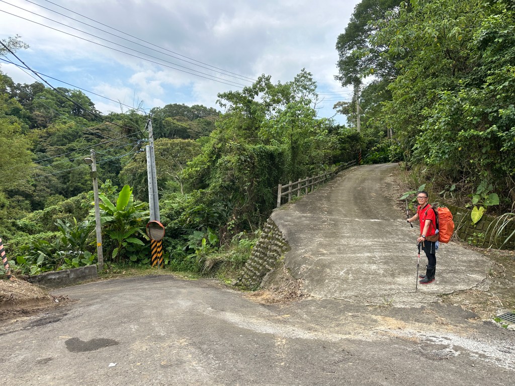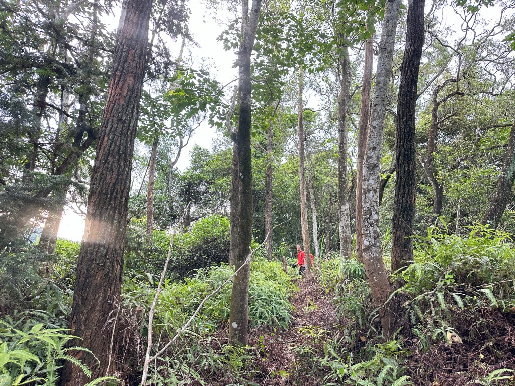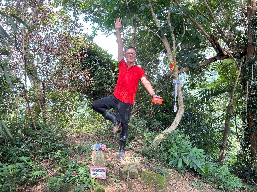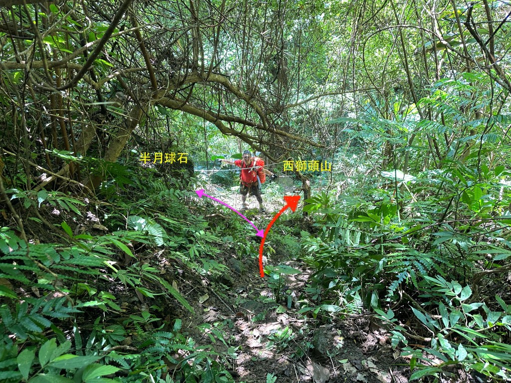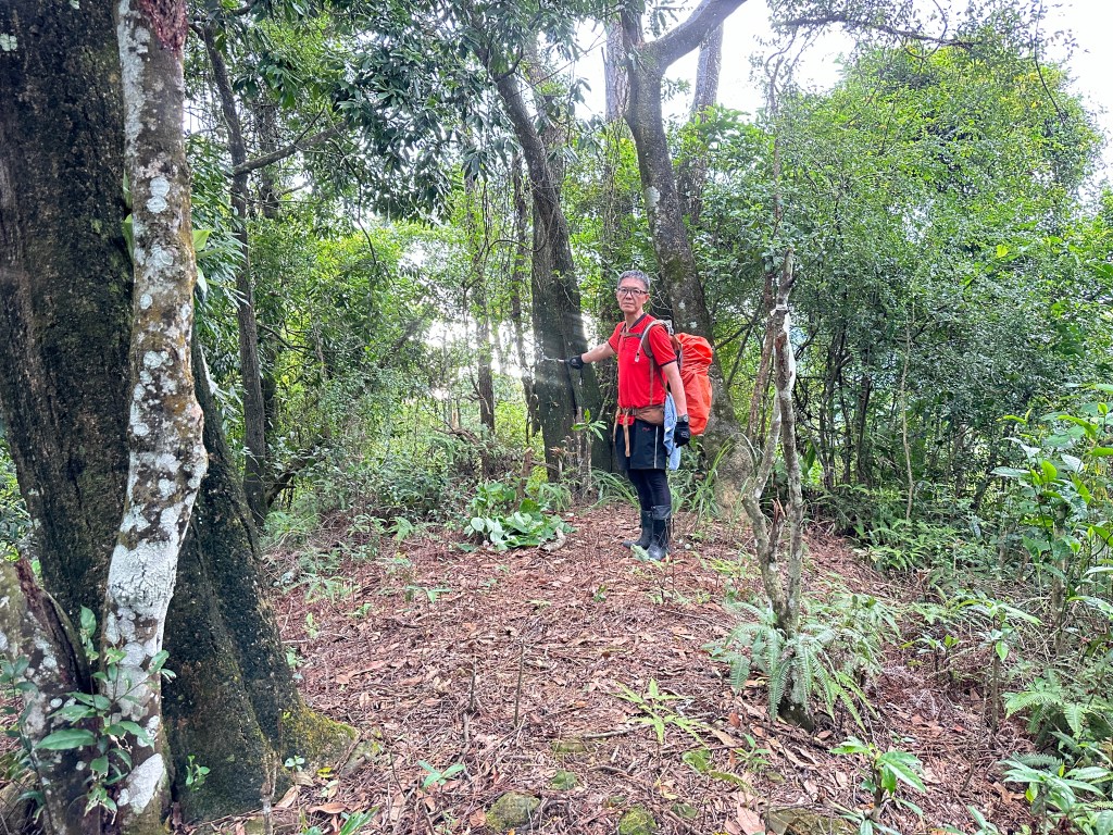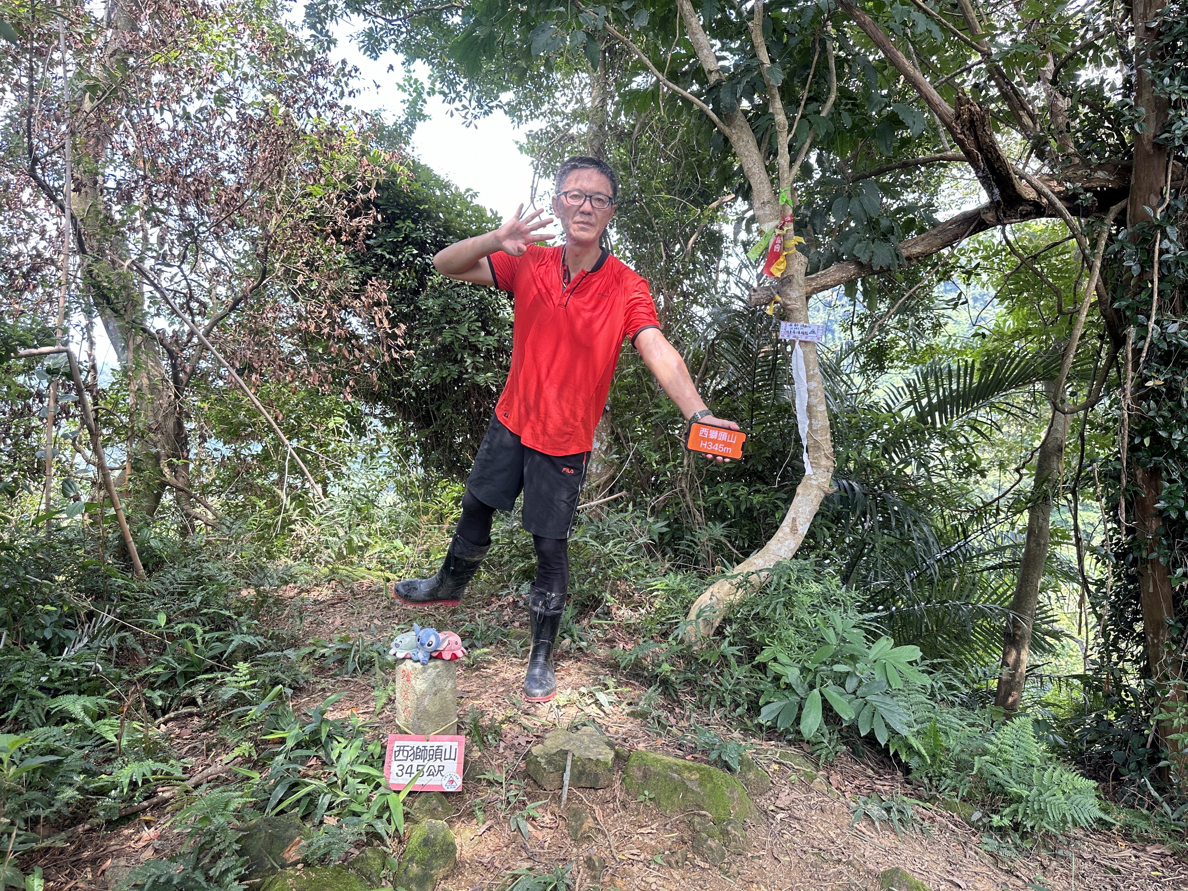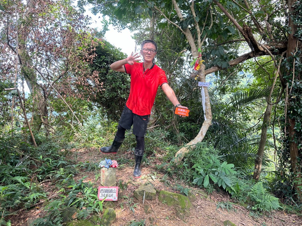 在平緩路段走了約100m後,往右岔斜坡開始陡上走約300m後,即會來到西獅頭山,兩人在此吃了午餐稍微休息了約35分鐘。離開西獅頭山後,陡下走100m即會來到三岔路口,若往左走是傳統路線,走300m後可以接上產業道路。兩人繼續往右前走,這一段是Jun與Smile兩人在2024.08.08所打通的路線,接著,沿著稜線路,經過345峰、332峰、330峰、333峰,再通過廢棄纜車平台,陡下接上馬福山,後面這一段就是Jun與桃園鐮刀隊「雙刀劉」一起打通的路線。