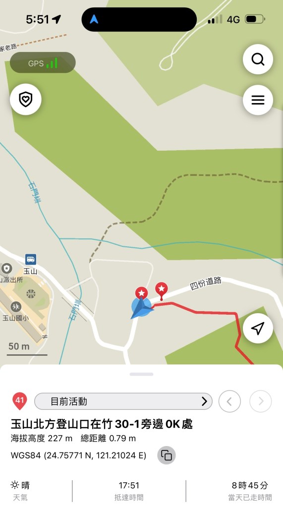兩人在「玉山」此處拍照並再度吃些行動糧,接著下山,要走700m可接上竹30-1線,一開始的前200m比較陡滑,後段就緩下一路接上馬路。再踢700m的馬路在傍晚6點回到太元宮,完成今天的O型。✅