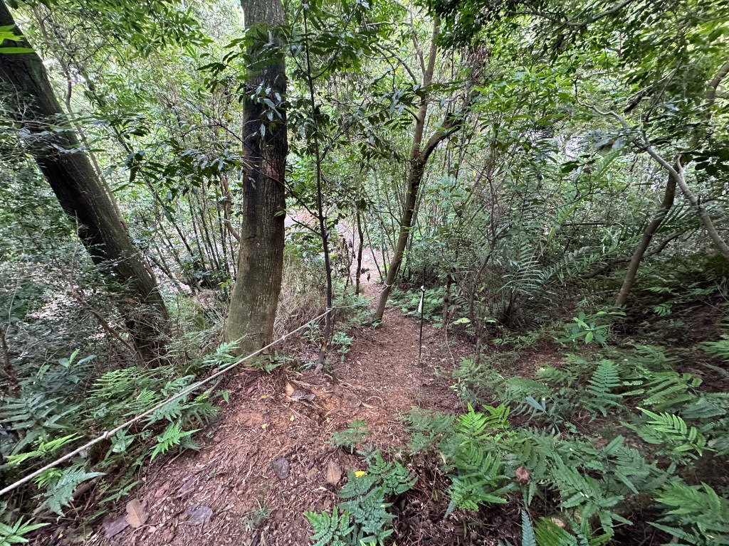這時,打電話給Smile,Smile告訴我,Jun已經將西登山口路線打通,我們約在四坪寮山見!我則繼續沿著山徑走,看來路徑條件超好,因此,我想也不再需要看離線地圖上的軌跡。疑?好像有一小段時間沒有看到登山布條了?打開離線地圖一看!糟!在前方150m有一處就必須右轉直接拉繩垂直陡上,其實,我走錯的這一段也幾乎要接上馬路了!但為了讓GPX的路徑正確,我仍然陡回到正確路徑上。