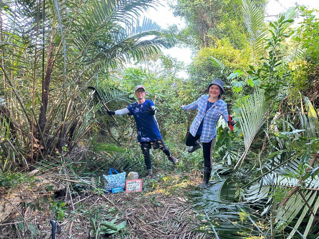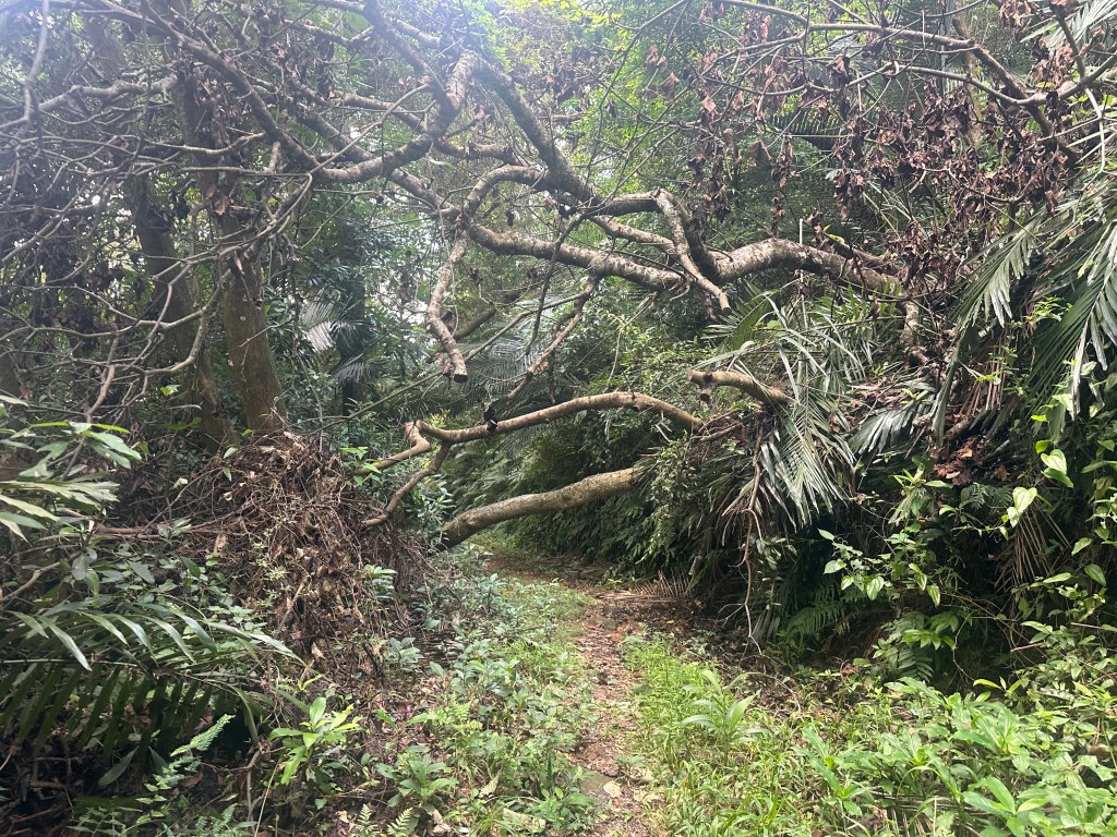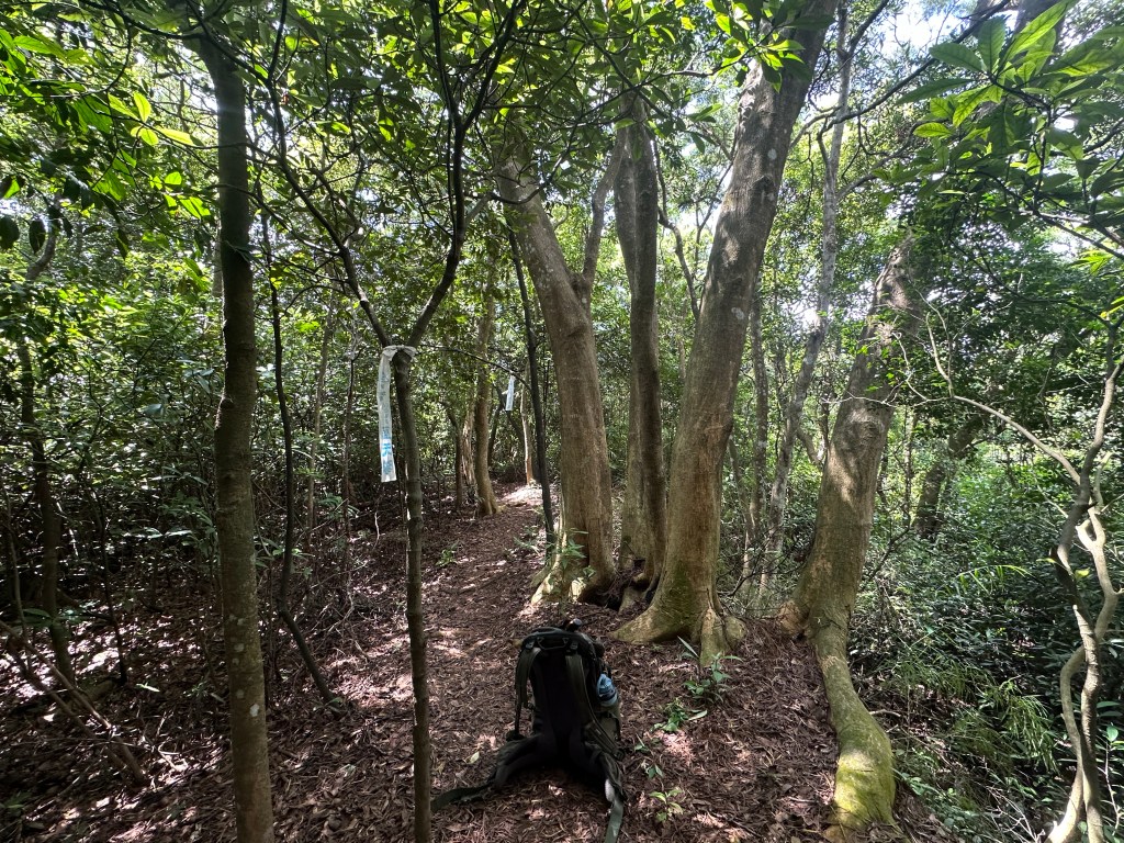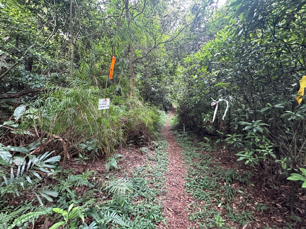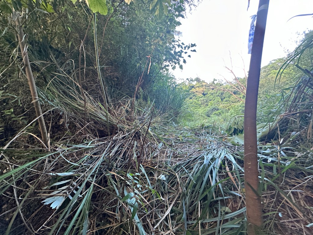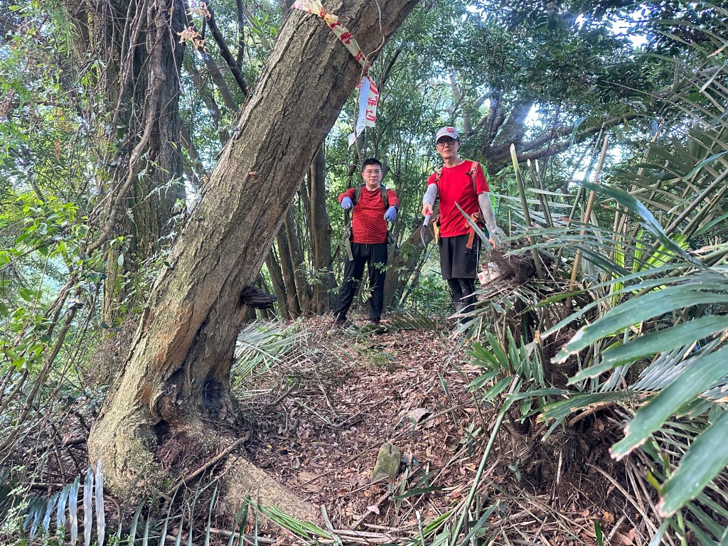 因此在隔天2024.09.04兩人再約Dora、Kenny一起來打通東登山口到四坪寮山,有了前一天的基礎,加上今天有四個人,進展的速度變得快多了!其中為了安全,Smile一路蹲在芒草下方看著一路的下方土地是否紮實好踩踏,而Dora、Kenny與Jun三人則一路砍除、壓平、踩實芒草,並修整雜草倒木,一路由芒草區到開始陡上進入稜線路,由東登山口(24.707050, 121.078384)一路砍進來陡上到三岔峰的距離有0.7K,再由三岔峰左彎一路直直往四坪寮山繼續砍除350m的距離來到四坪寮山。沒有想到,居然成功了!這四位帶有傻勁且堅持的伙伴,套一句話,真是「牛逼」啊!