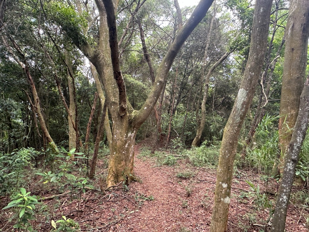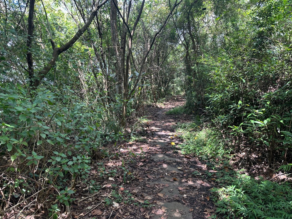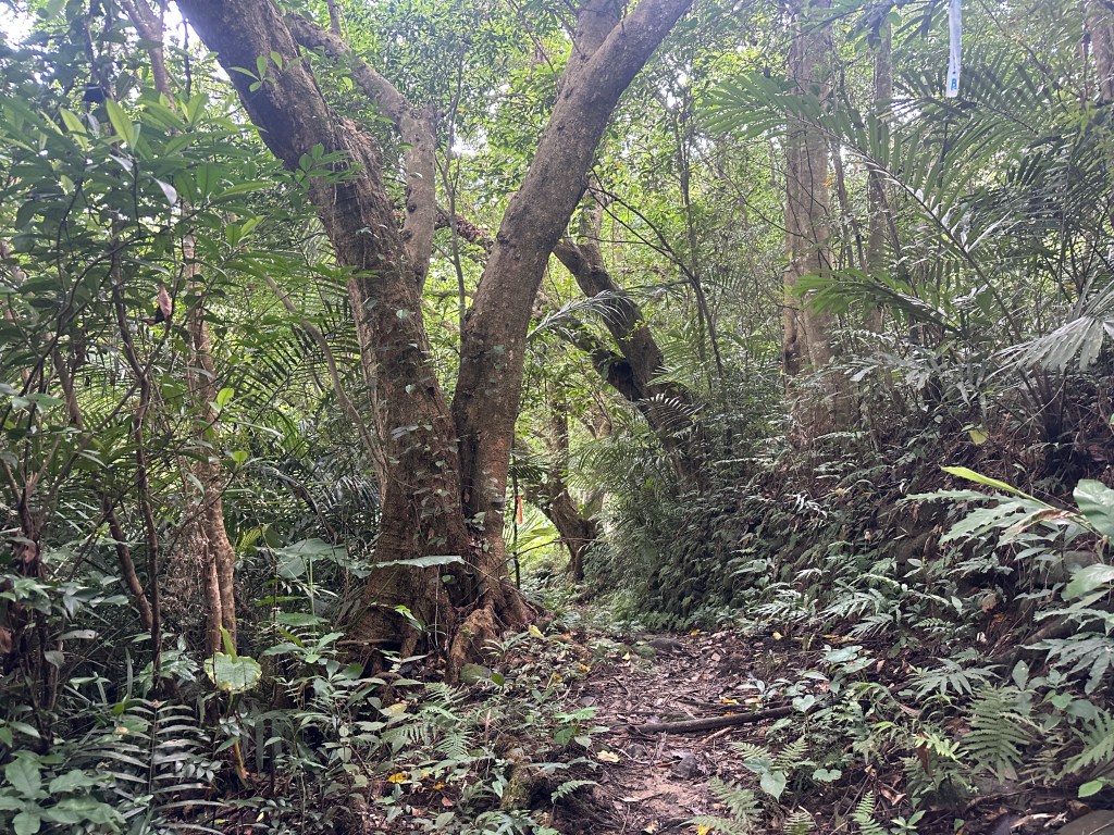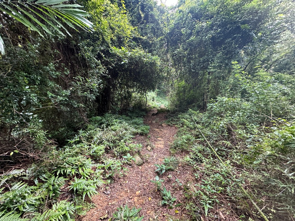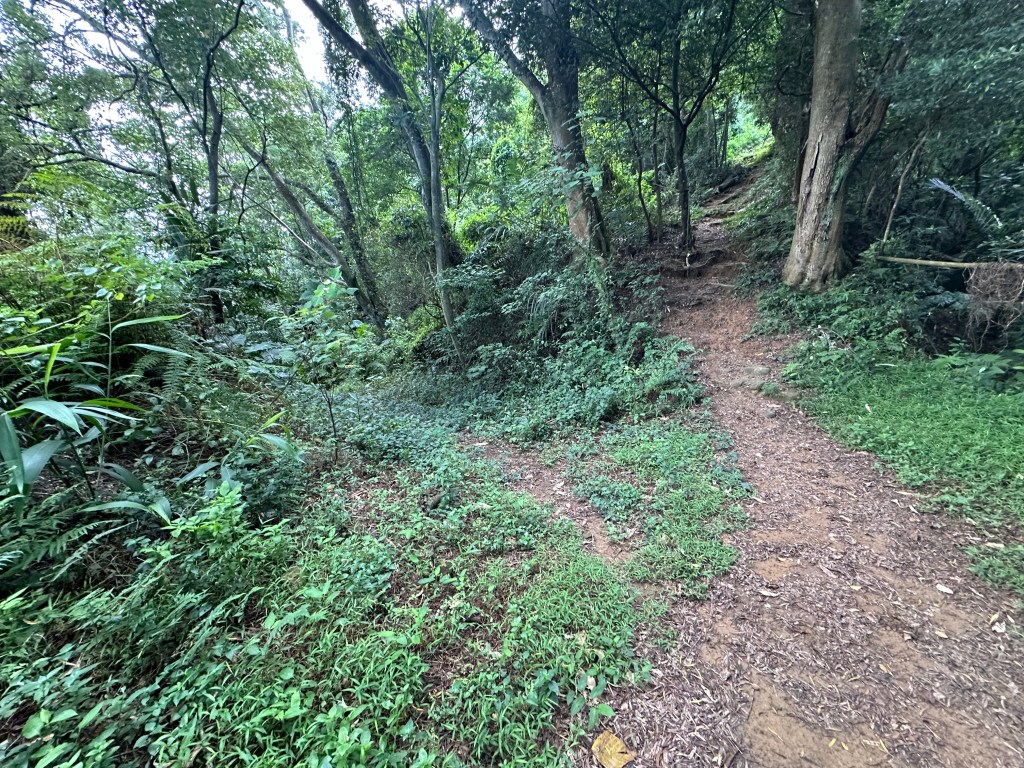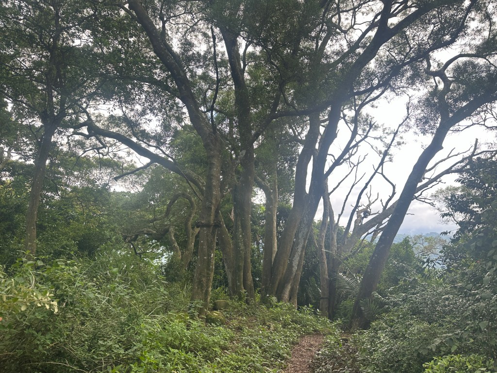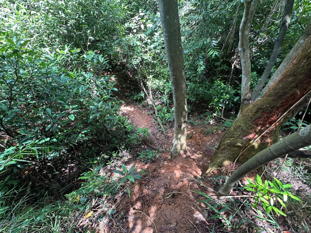 往前走了一段,出現一處5m的急陡坡,還在想,接下來不會都是陡上陡下的路徑吧?陡上後一看,真是康莊大道啊!一路到達樹杞林山,起伏都在20m之內,中途會通過一處寬闊無林蔭的平台,看起來真是相當的優美!這一段的過程遇到兩次虎頭蜂的巡邏峰,安靜快速通過!