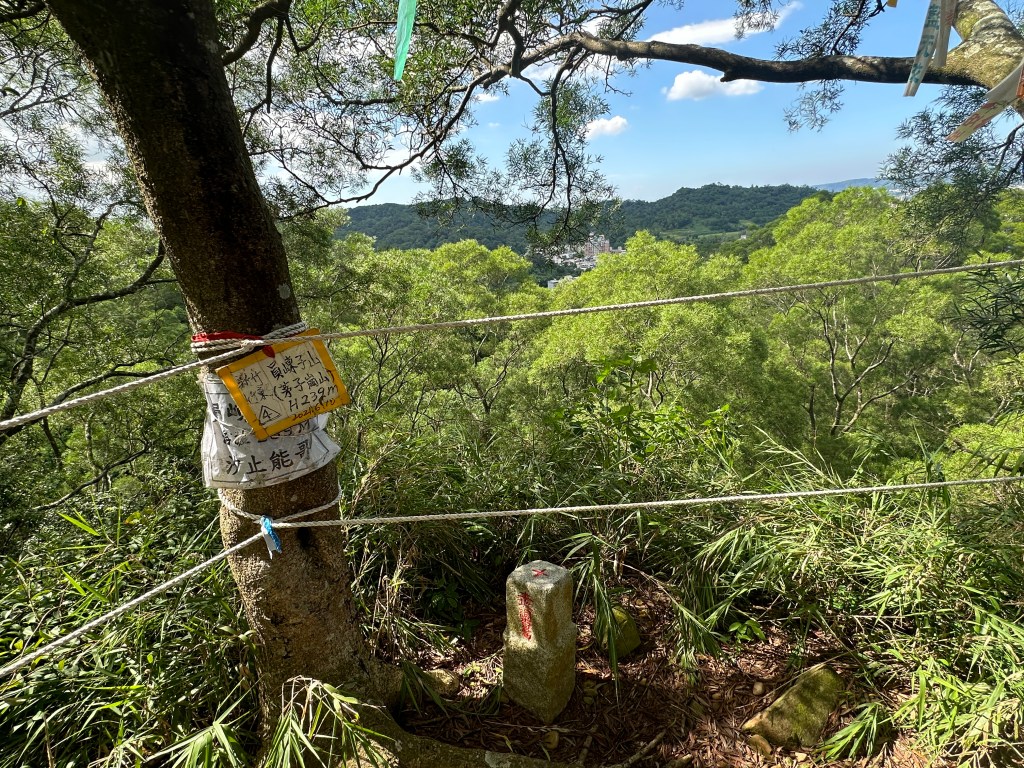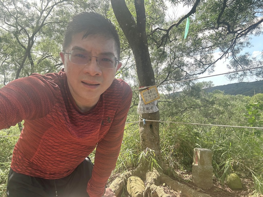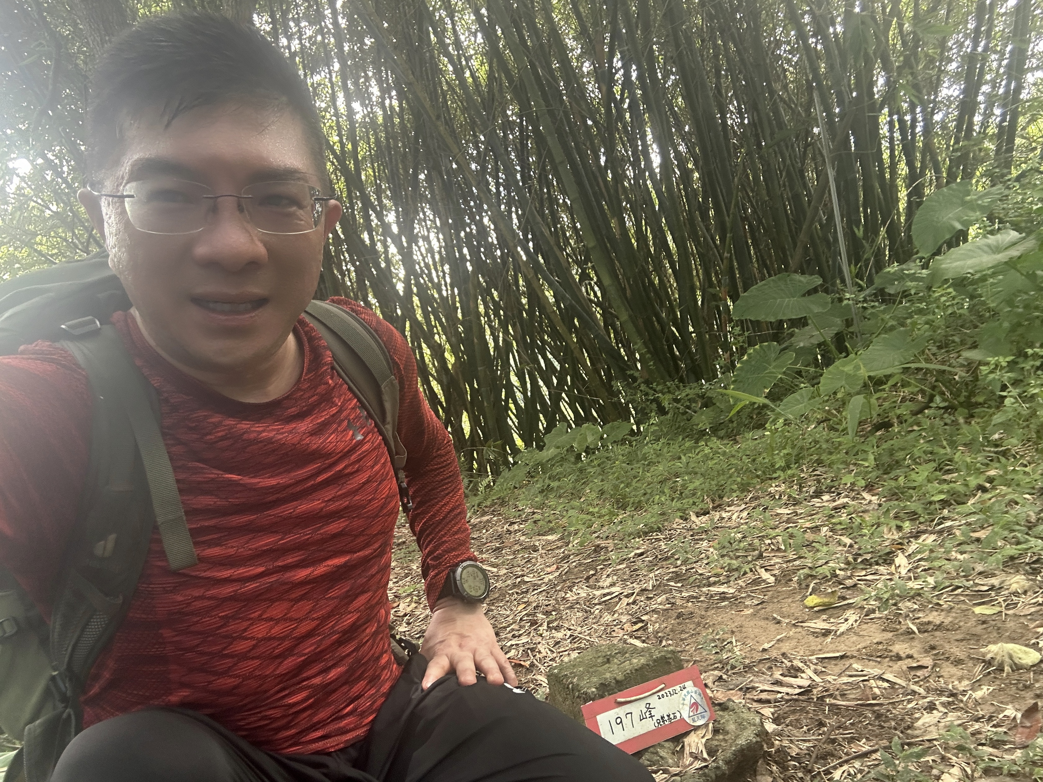 這裡就是兄弟基石登山口,陡上後先經過198峰、197峰,繼續前走,陡上到一個有木椅的假山頭平台,由平台左側,馬上直接幾乎垂直拉繩陡下,大概是因為太熱了,整日都沒有看到人,此時好不容易看到一位老先生,就在陡下後的十字路山徑口這裡正在運動,至少,有人可以寒暄一下!講講話!