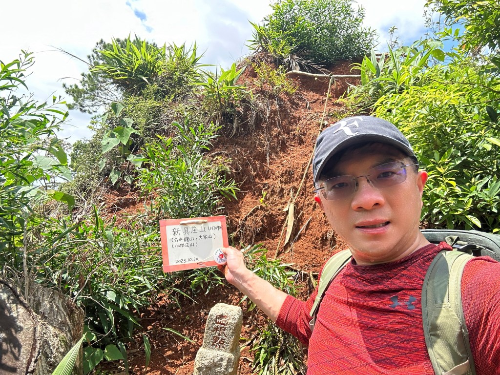 沿著公路陡上走到就在路邊左側的新具庄山登山口。一開始就是陡上,陡上到稜線上後,我繼續直走,走錯了!稍微觀察了一下,一上稜線就要往右轉入,抵達新具庄山後,一開始我找不到接續的路線?在此左突右衝了一下,乾脆爬到三角點的上方的最高土丘,居高臨下觀察了一下,發現往北的路線,就是在三角點這一條路線上往南走,感覺上好像方向不對,但走一段後路徑會往右彎,接著就接上了正確路線!